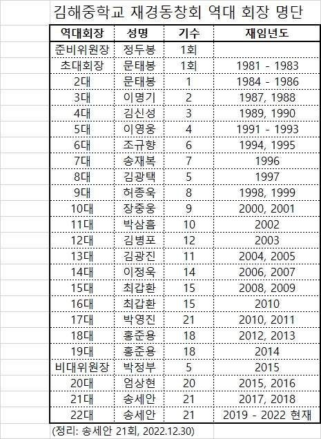 김해중학교 재경동창회 역대회장 명단 (2022.12.31) 작성자송세안 21회|작성시간22.12.31|조회수32 목록 댓글 0 글자크기 작게가 글자크기 크게가 김해중재경동창회 역대회장 명단_20221231.xlsx10.62KB 첨부파일첨부된 파일이 2개 있습니다. jpg 파일 김해중재경동창회 역대회장 명단_20221231.jpg 다운로드 xlsx 파일 김해중재경동창회 역대회장 명단_20221231.xlsx 다운로드 다음검색 현재 게시글 추가 기능 열기 북마크 신고 센터로 신고 댓글 댓글 0 댓글쓰기 답글쓰기 댓글 리스트
