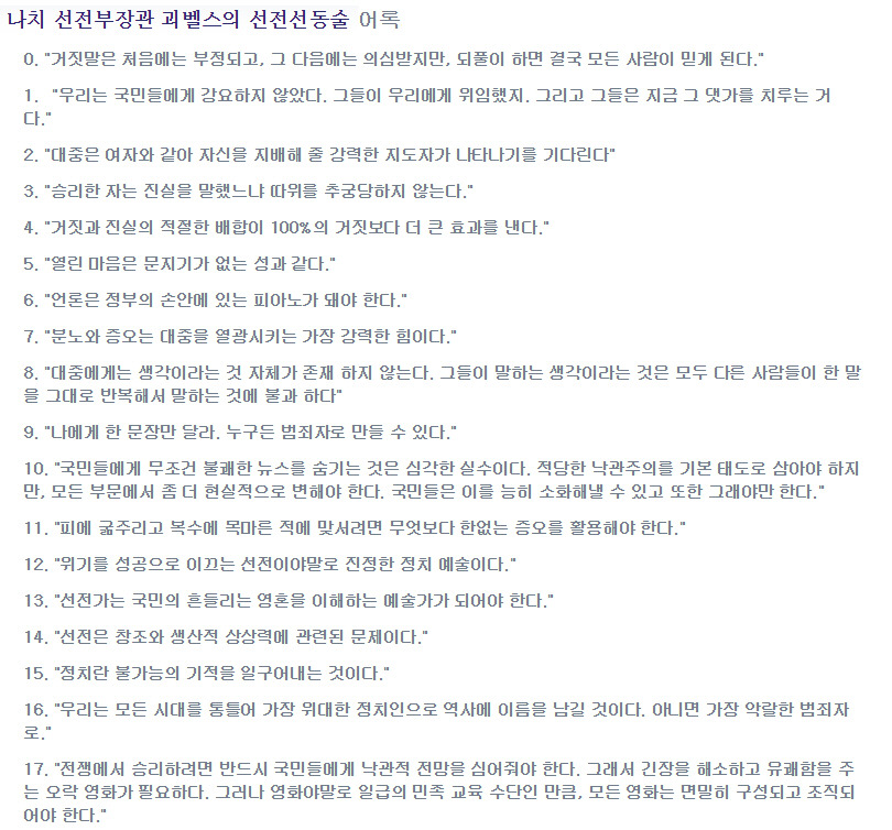 나치 선전부장관 괴벨스의 선전선동술 어룩 작성자텔레파시통신|작성시간16.09.28|조회수223 목록 댓글 0 글자크기 작게가 글자크기 크게가 내용 출처: http://fullbright.tistory.com/119 다음검색 현재 게시글 추가 기능 열기 북마크 공유하기 신고 센터로 신고 댓글 댓글 0 댓글쓰기 답글쓰기 댓글 리스트