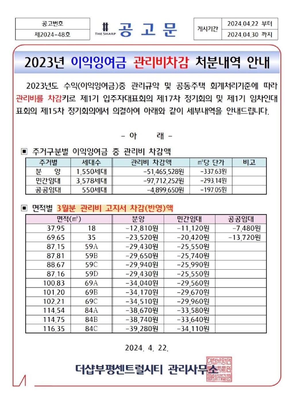 2023년 이익잉여금 관리비차감 처분 안내 작성자walk1004|작성시간24.04.25|조회수50 목록 댓글 0 글자크기 작게가 글자크기 크게가 다음검색 현재 게시글 추가 기능 열기 북마크 공유하기 신고 센터로 신고 댓글 댓글 0 댓글쓰기 답글쓰기 댓글 리스트