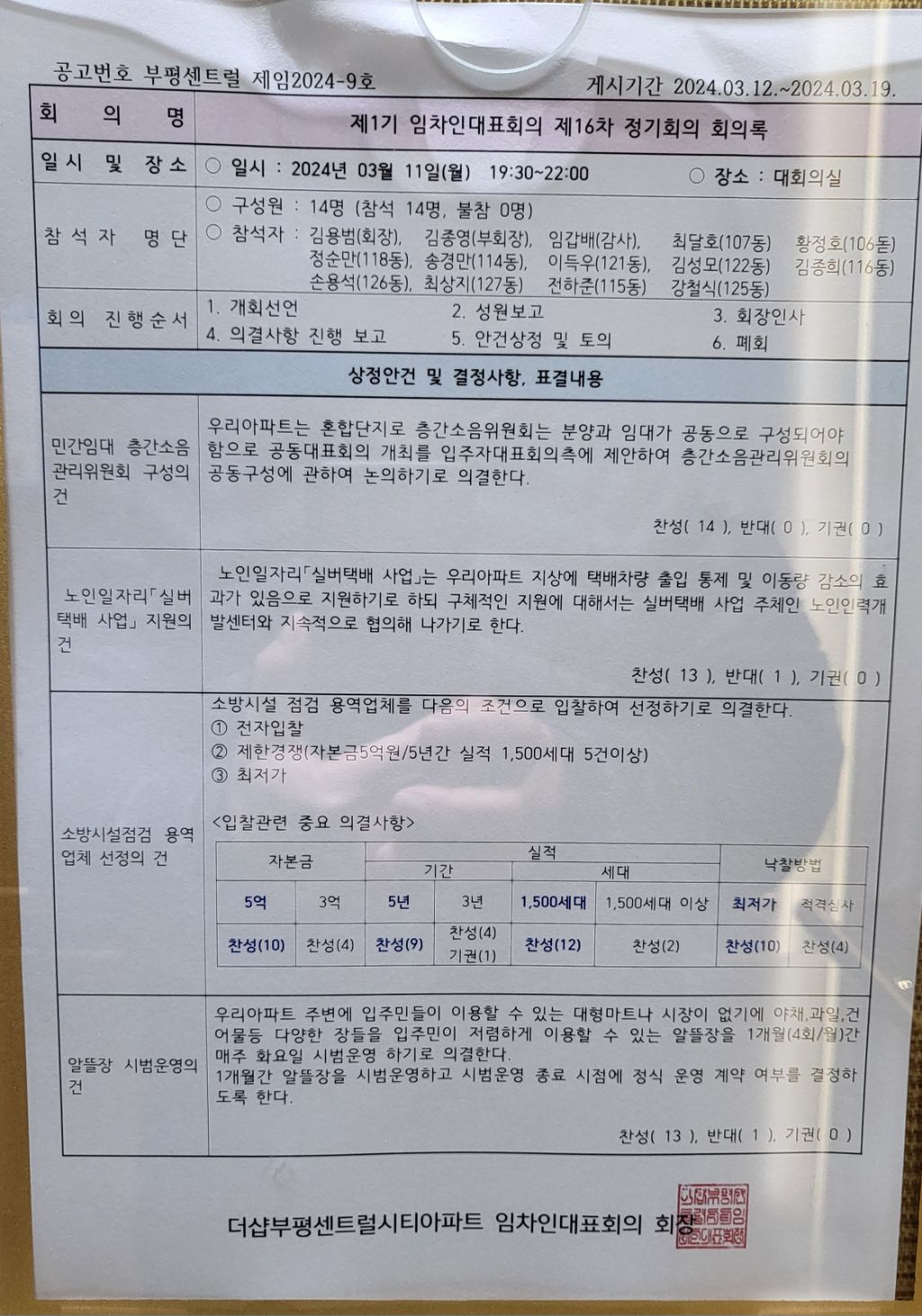 임차인대표회의제16차정기회의결과공고(층간소음 노인일자리 소방시설용역 알뜰장유치등) 작성자walk1004|작성시간24.03.13|조회수30 목록 댓글 0 글자크기 작게가 글자크기 크게가 다음검색 현재 게시글 추가 기능 열기 북마크 공유하기 신고 센터로 신고 댓글 댓글 0 댓글쓰기 답글쓰기 댓글 리스트