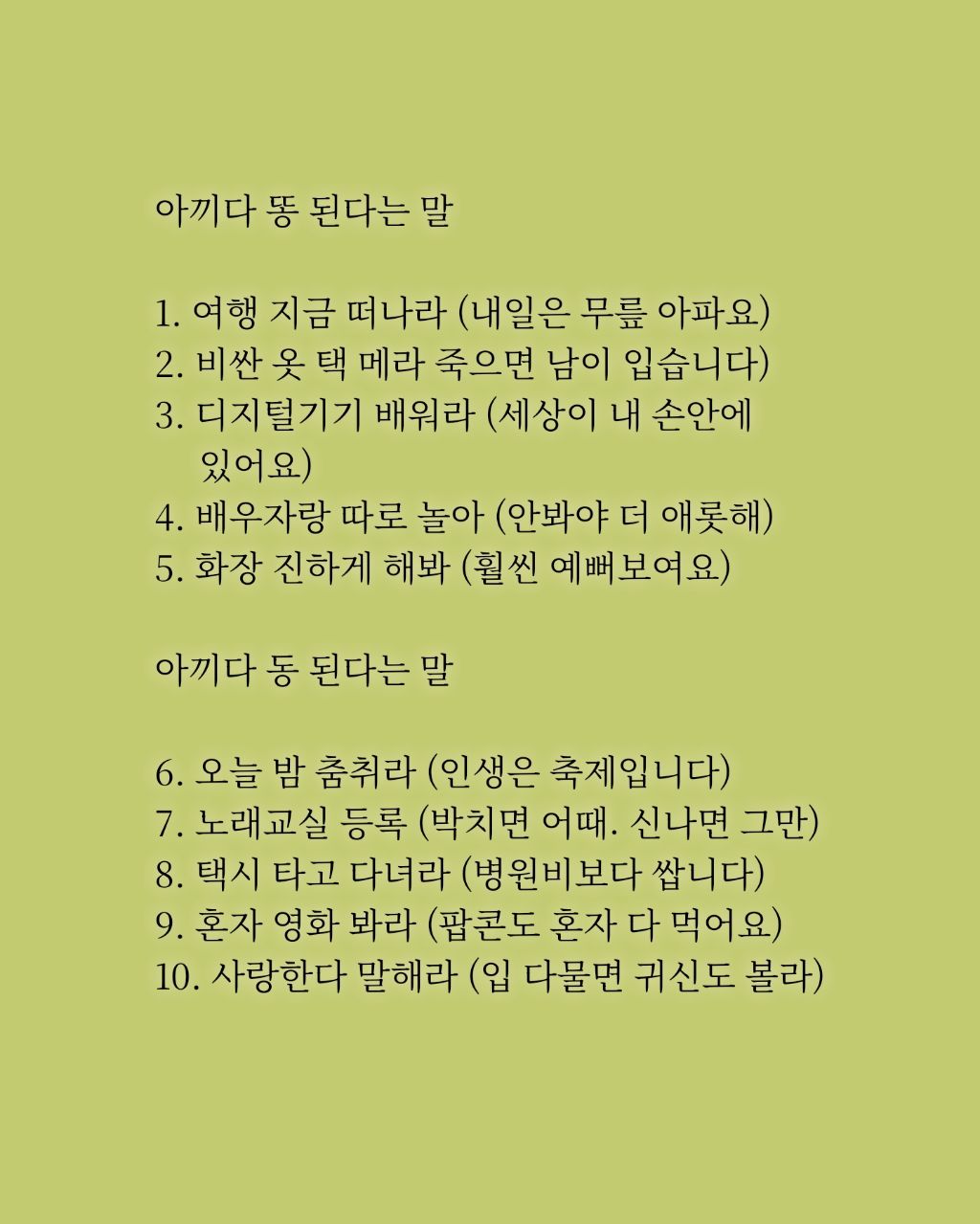 아끼다가 똥된다. 작성자隨處作主 . 수처작주|작성시간26.04.01|조회수138 목록 댓글 4 글자크기 작게가 글자크기 크게가 다음검색 현재 게시글 추가 기능 열기 북마크 공유하기 신고 센터로 신고 댓글 댓글 4 댓글쓰기 답글쓰기 댓글 리스트 작성자밝은하늘 | 작성시간 26.04.01 좋은글에 다녀갑니다 답댓글 작성자隨處作主 . 수처작주 작성자 본인 여부 작성자 | 작성시간 26.04.01 이미지 확대 작성자쌍둥이 엄마 | 작성시간 26.04.01 동감 합니다.감사 합니다~^^ 이미지 확대 작성자김종승 | 작성시간 26.04.02 감사합니다 댓글 전체보기