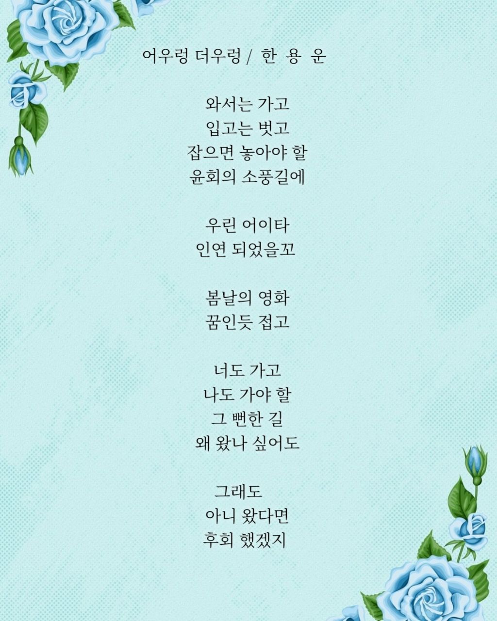 * 어우렁,더우렁 / 한용운 * 작성자隨處作主 . 수처작주|작성시간25.12.30|조회수266 목록 댓글 4 글자크기 작게가 글자크기 크게가 다음검색 현재 게시글 추가 기능 열기 북마크 공유하기 신고 센터로 신고 댓글 댓글 4 댓글쓰기 답글쓰기 댓글 리스트 작성자가을아 | 작성시간 25.12.30 굿 답댓글 작성자隨處作主 . 수처작주 작성자 본인 여부 작성자 | 작성시간 25.12.31 작성자푸른열정 | 작성시간 25.12.30 수고하셨습니다 답댓글 작성자隨處作主 . 수처작주 작성자 본인 여부 작성자 | 작성시간 25.12.31 댓글 전체보기