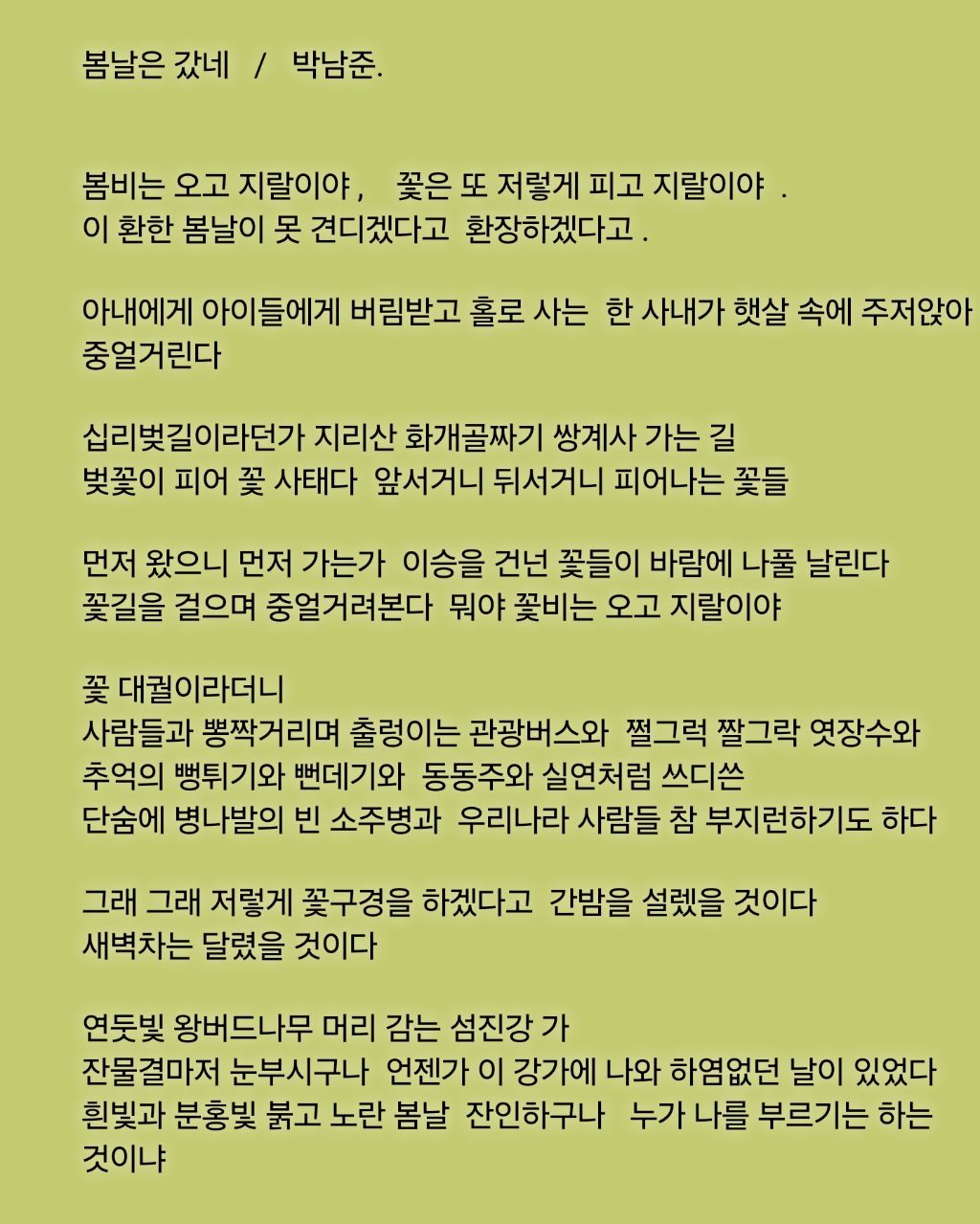 봄날은 갔네 / 박남준 작성자隨處作主 . 수처작주|작성시간26.04.02|조회수83 목록 댓글 3 글자크기 작게가 글자크기 크게가 다음검색 현재 게시글 추가 기능 열기 북마크 공유하기 신고 센터로 신고 댓글 댓글 3 댓글쓰기 답글쓰기 댓글 리스트 작성자밝은하늘 | 작성시간 26.04.02 new 행시방에 좋은글올리셨네요수처작주 님 행복 하시기를 바랍니다 이미지 확대 답댓글 작성자隨處作主 . 수처작주 작성자 본인 여부 작성자 | 작성시간 26.04.02 new 감사합니다 작성자쌍둥이 엄마 | 작성시간 26.04.02 new 감사 합니다~ 이미지 확대 댓글 전체보기