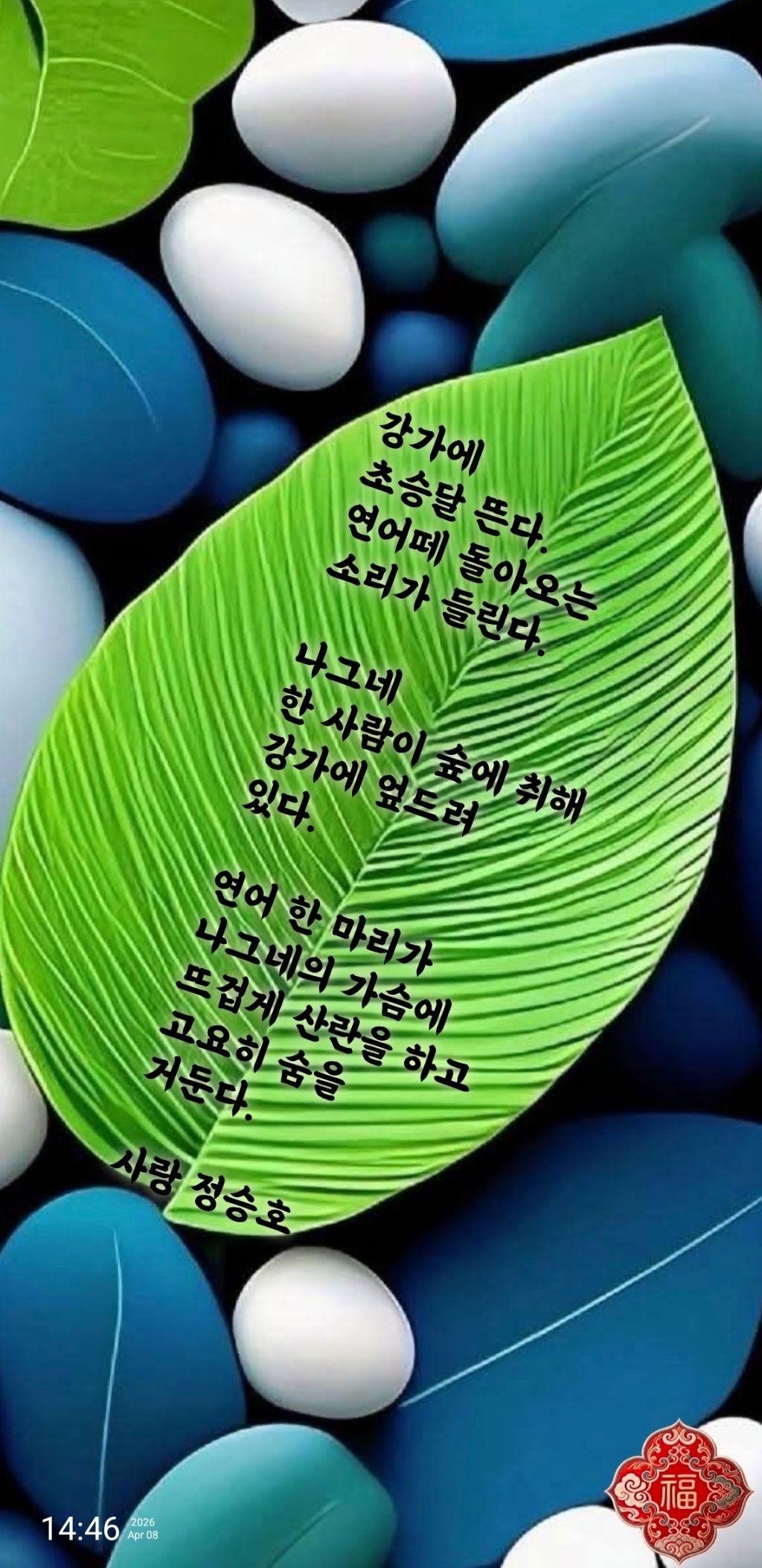 사랑. / 정승호. 작성자隨處作主 . 수처작주|작성시간26.04.08|조회수151 목록 댓글 1 글자크기 작게가 글자크기 크게가 다음검색 현재 게시글 추가 기능 열기 북마크 공유하기 신고 센터로 신고 댓글 댓글 1 댓글쓰기 답글쓰기 댓글 리스트 작성자샤넬옥 | 작성시간 26.04.08 수처작주님 사랑 \ 정승호님 시행시방에 올려주셔서요 감사드립니다 요즘 행시방빛내주시고 감사드림니다 좋은하루 되시기 바랍니다 이미지 확대 댓글 전체보기