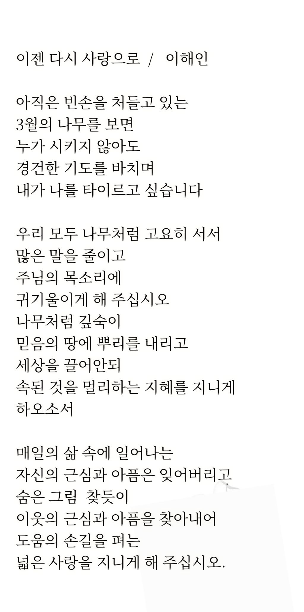 이젠 다시 사랑으로 / 이해인. 작성자隨處作主 . 수처작주|작성시간26.04.10|조회수123 목록 댓글 4 글자크기 작게가 글자크기 크게가 다음검색 현재 게시글 추가 기능 열기 북마크 공유하기 신고 센터로 신고 댓글 댓글 4 댓글쓰기 답글쓰기 댓글 리스트 작성자샤넬옥 | 작성시간 26.04.10 new 수처작주님 이해인님 시 좋은 글 올려주셔서요 감사드림니다수고하셨어요 남은시간도 좋은시간 되시기 바랍니다 이미지 확대 답댓글 작성자隨處作主 . 수처작주 작성자 본인 여부 작성자 | 작성시간 26.04.10 new 감사합니다 작성자바람우분트 | 작성시간 26.04.10 new 감사합니다~ 답댓글 작성자隨處作主 . 수처작주 작성자 본인 여부 작성자 | 작성시간 26.04.10 new 댓글 전체보기