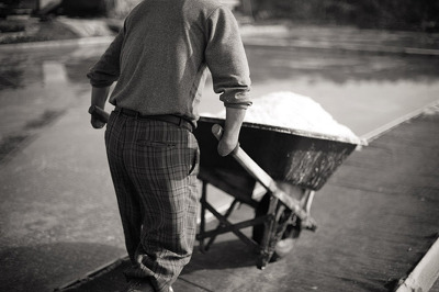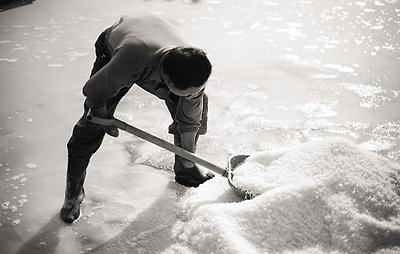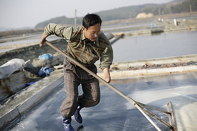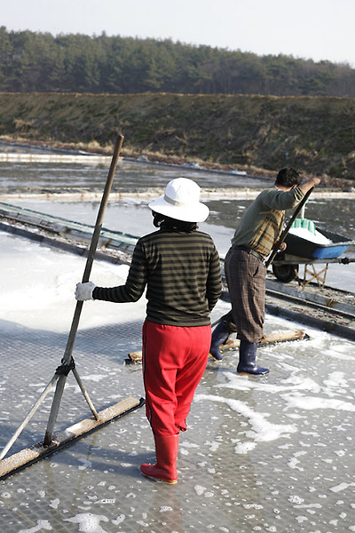 손 없는 남편이 능숙하고 진지한 몸짓으로 소금을 모으면 아내는 얌전하게 삽으로