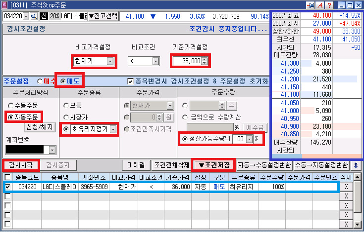 하단 하늘색 박스 부분이 LG디스플레이 현재가가 36,000원 미만인 경우 보유수량의 100%를 최유리지정가로 자동으로 자동손절매 주문이 나가도록 설정한 화면입니다.