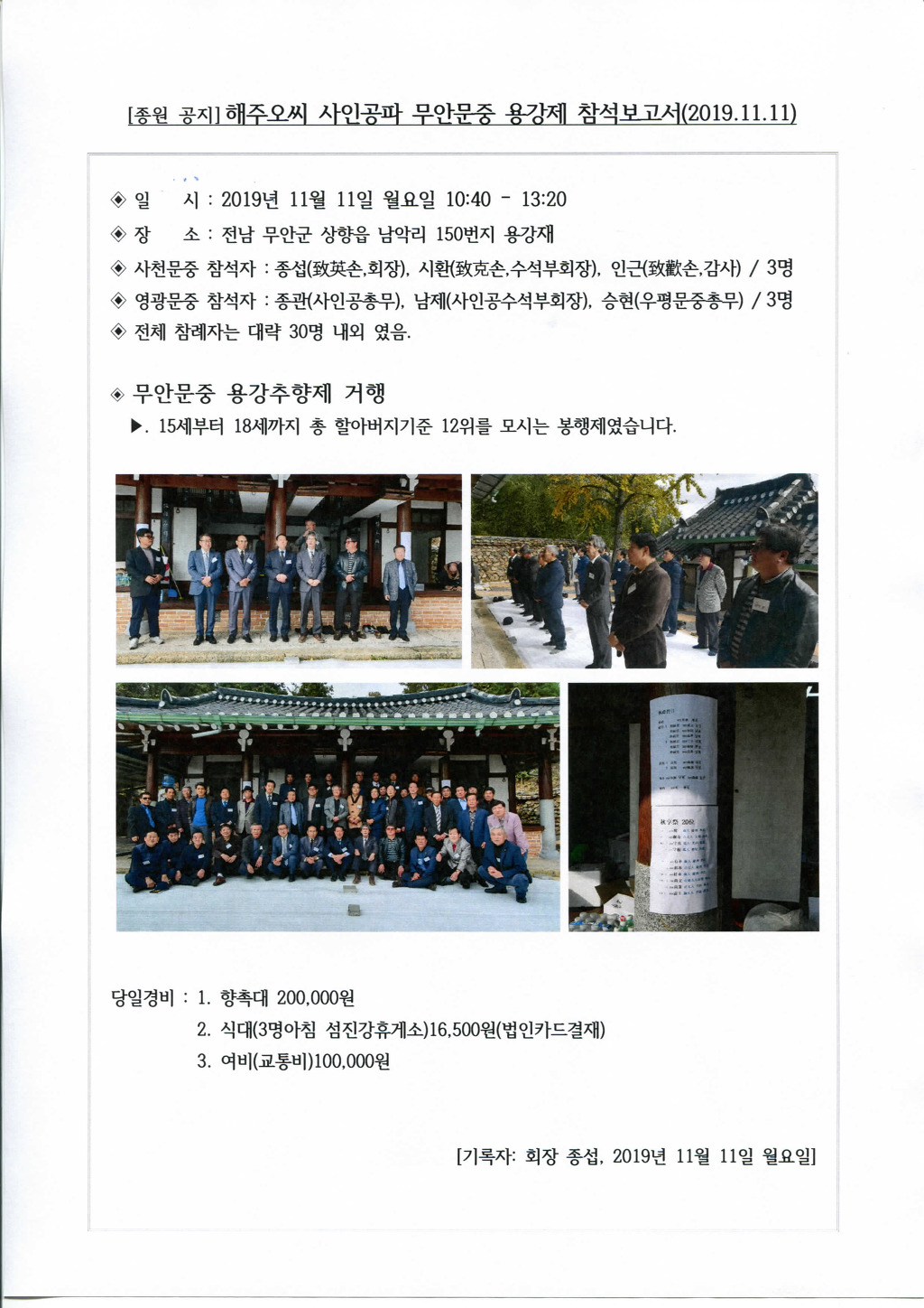 해주오씨 무안문중 용강제 참석보고_2019.11.11 작성자주환(致克)|작성시간19.11.18|조회수158 목록 댓글 0 글자크기 작게가 글자크기 크게가 다음검색 현재 게시글 추가 기능 열기 북마크 신고 센터로 신고 댓글 댓글 0 댓글쓰기 답글쓰기 댓글 리스트