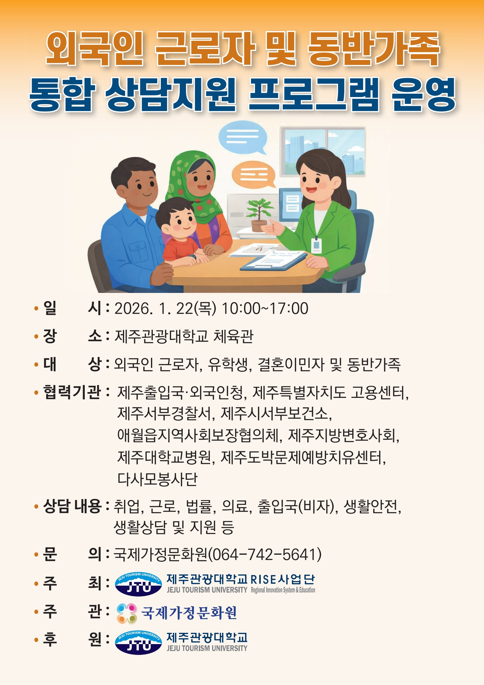외국인 근로자 및 동반가족 통합상담 지원 프로그램 운영 작성자써니|작성시간26.01.13|조회수7 목록 댓글 0 글자크기 작게가 글자크기 크게가 다음검색 현재 게시글 추가 기능 열기 북마크 공유하기 신고 센터로 신고 댓글 댓글 0 댓글쓰기 답글쓰기 댓글 리스트