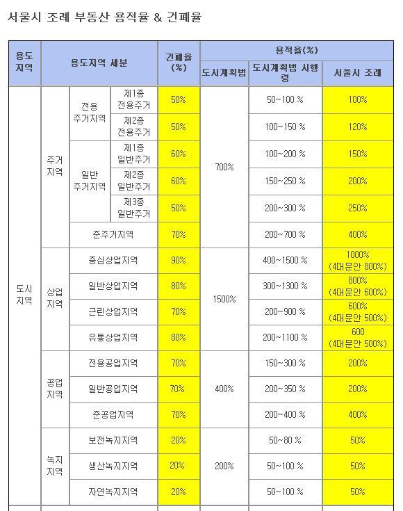 도시계획에서는 건축밀도의 제한을 위해 「국토의 계획 및 이용에 관한 법률」에 의한 다음의 범위 내에서 지방자치단체의 조례를 통해 용도지역별로 건폐율을 제한하고 있다.