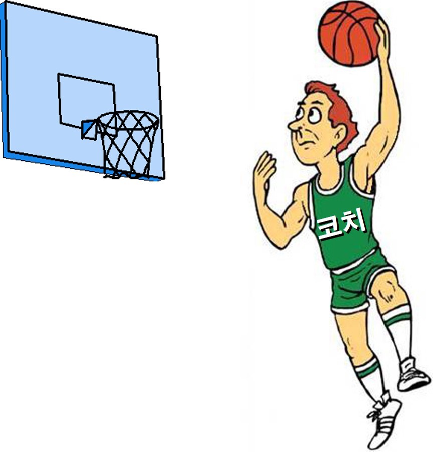 이 그림에 있는 문제는 원핸드 덩크슛을 하는 사람이 코치라는 것입니다. 코치는 선수가 더 경기를 잘하도록 하는 사람이지 본인이 덩크슛이나 3점슛을 성공하는 사람이 아닙니다.