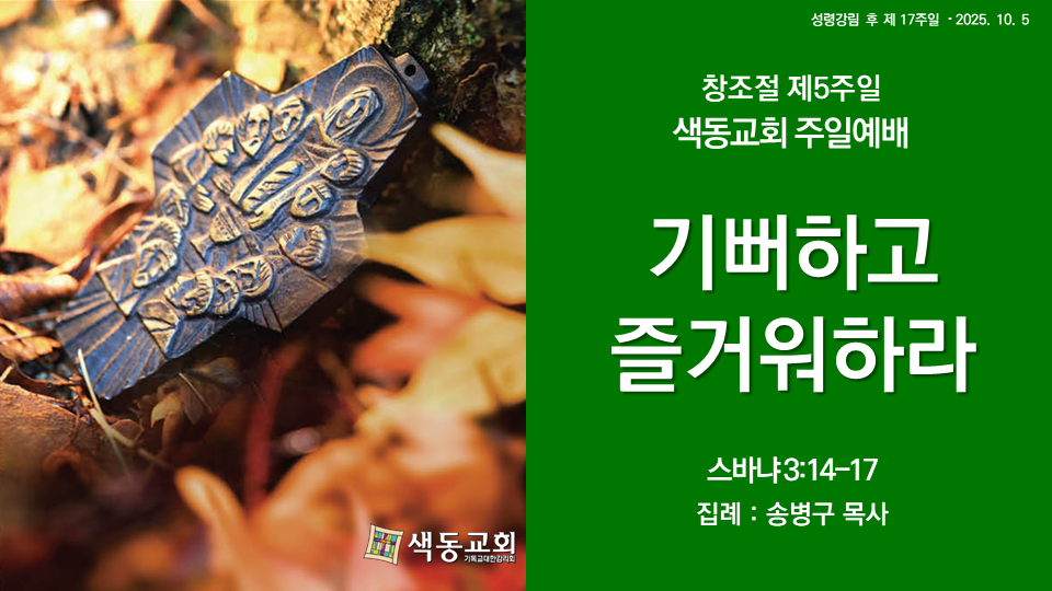 [색동교회 주일예배 설교] 기뻐하고 즐거워하라 - 창조절 제5주일 (2025.10.5) 작성자노승혁|작성시간25.10.05|조회수33 목록 댓글 0 글자크기 작게가 글자크기 크게가 제목 : 기뻐하고 즐거워하라 말씀 : 스바냐 3:14-17 설교 : 송병구 목사 https://youtu.be/uEcKYHCVCVU- YouTubewww.youtube.com 다음검색 현재 게시글 추가 기능 열기 북마크 공유하기 신고 센터로 신고 댓글 댓글 0 댓글쓰기 답글쓰기 댓글 리스트