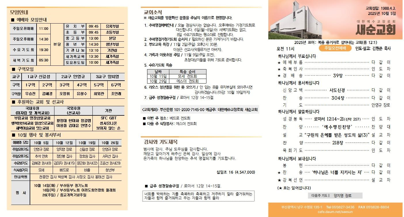 2025년 10월 5일 새순교회 주보(25-40호) 작성자최성덕|작성시간25.10.04|조회수120 목록 댓글 0 글자크기 작게가 글자크기 크게가 다음검색 현재 게시글 추가 기능 열기 북마크 공유하기 신고 센터로 신고 댓글 댓글 0 댓글쓰기 답글쓰기 댓글 리스트