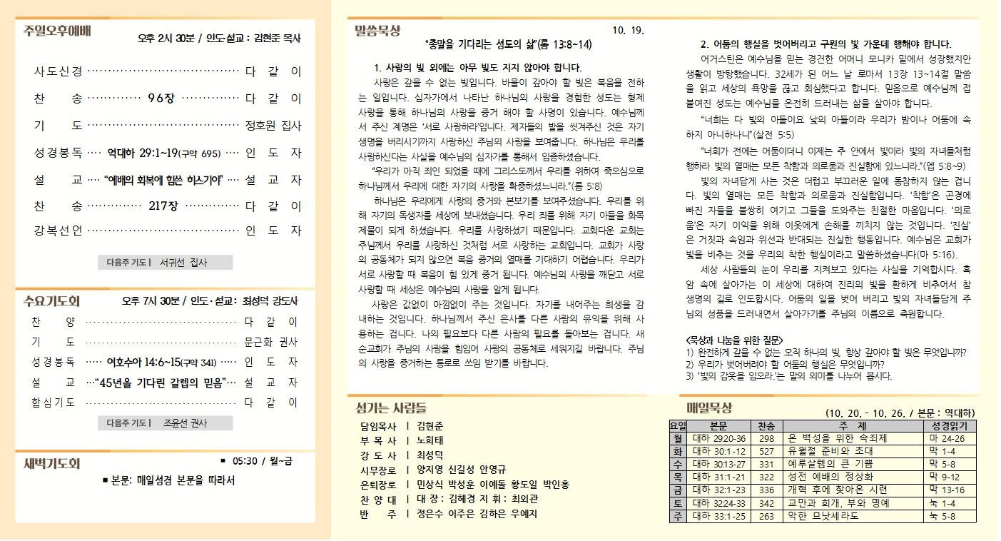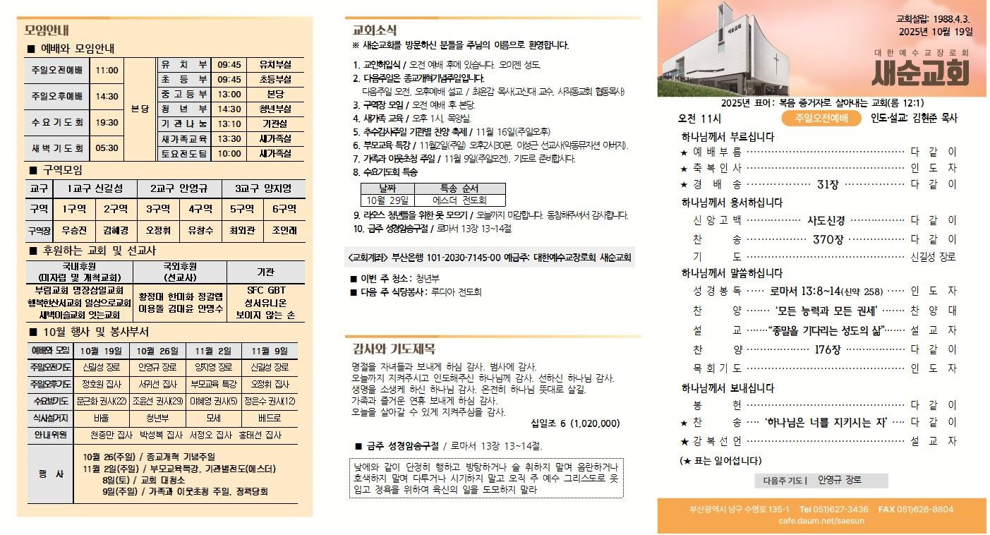 2025년 10월 19일 새순교회 주보(25-42호) 작성자최성덕|작성시간25.10.18|조회수126 목록 댓글 0 글자크기 작게가 글자크기 크게가 다음검색 현재 게시글 추가 기능 열기 북마크 공유하기 신고 센터로 신고 댓글 댓글 0 댓글쓰기 답글쓰기 댓글 리스트