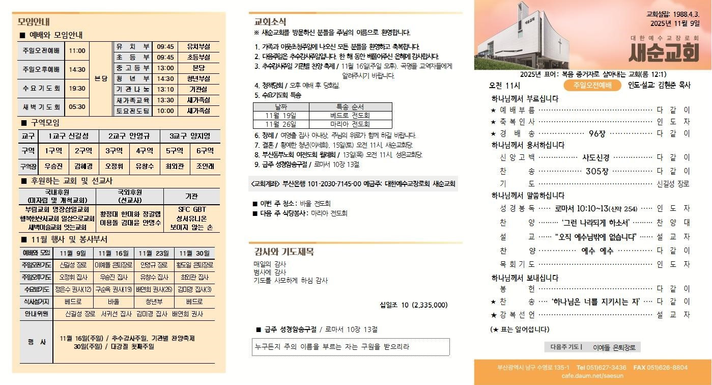 2025년 11월 9일 새순교회 주보(25-45호) 작성자최성덕|작성시간25.11.08|조회수103 목록 댓글 0 글자크기 작게가 글자크기 크게가 다음검색 현재 게시글 추가 기능 열기 북마크 공유하기 신고 센터로 신고 댓글 댓글 0 댓글쓰기 답글쓰기 댓글 리스트