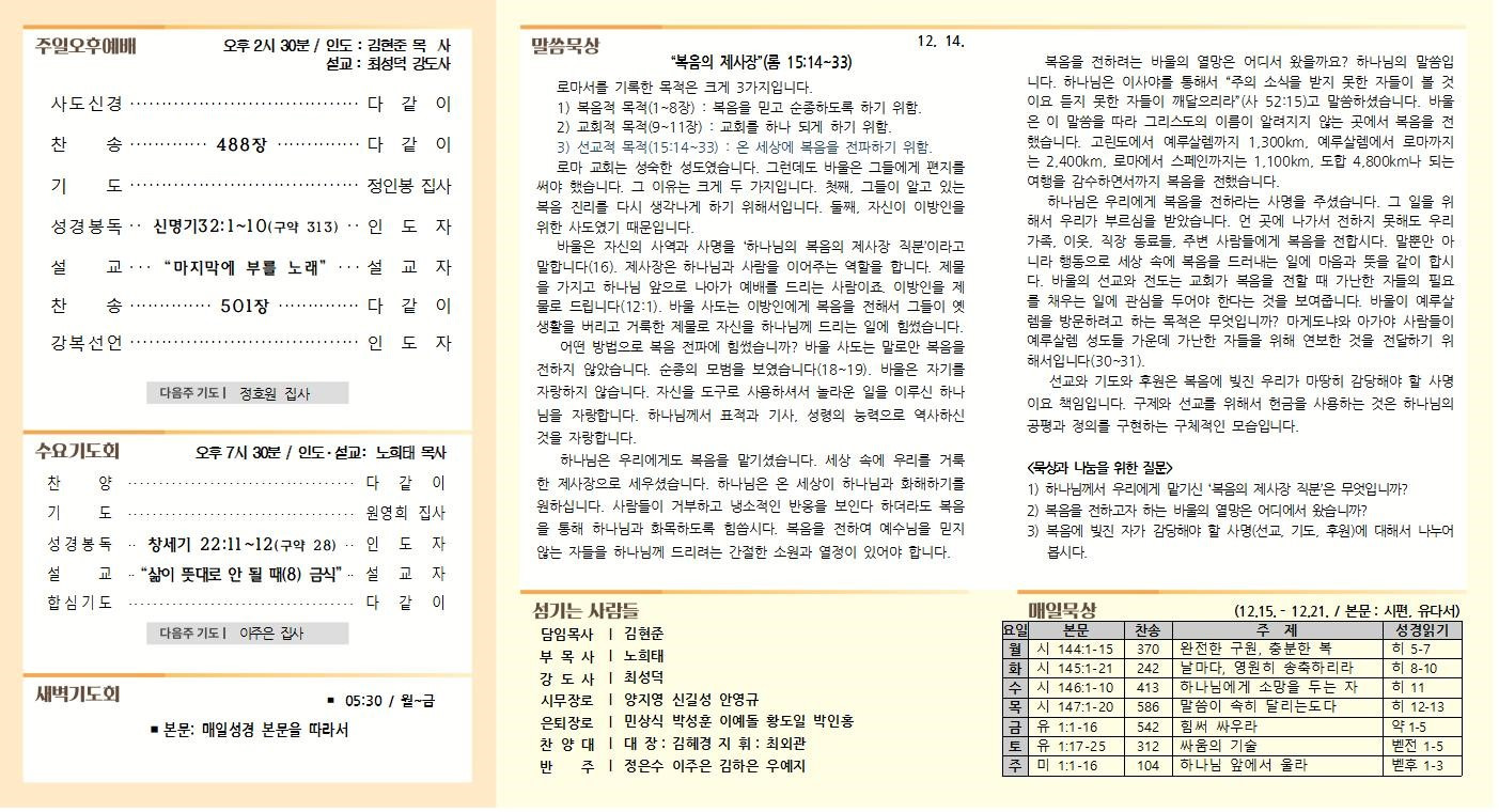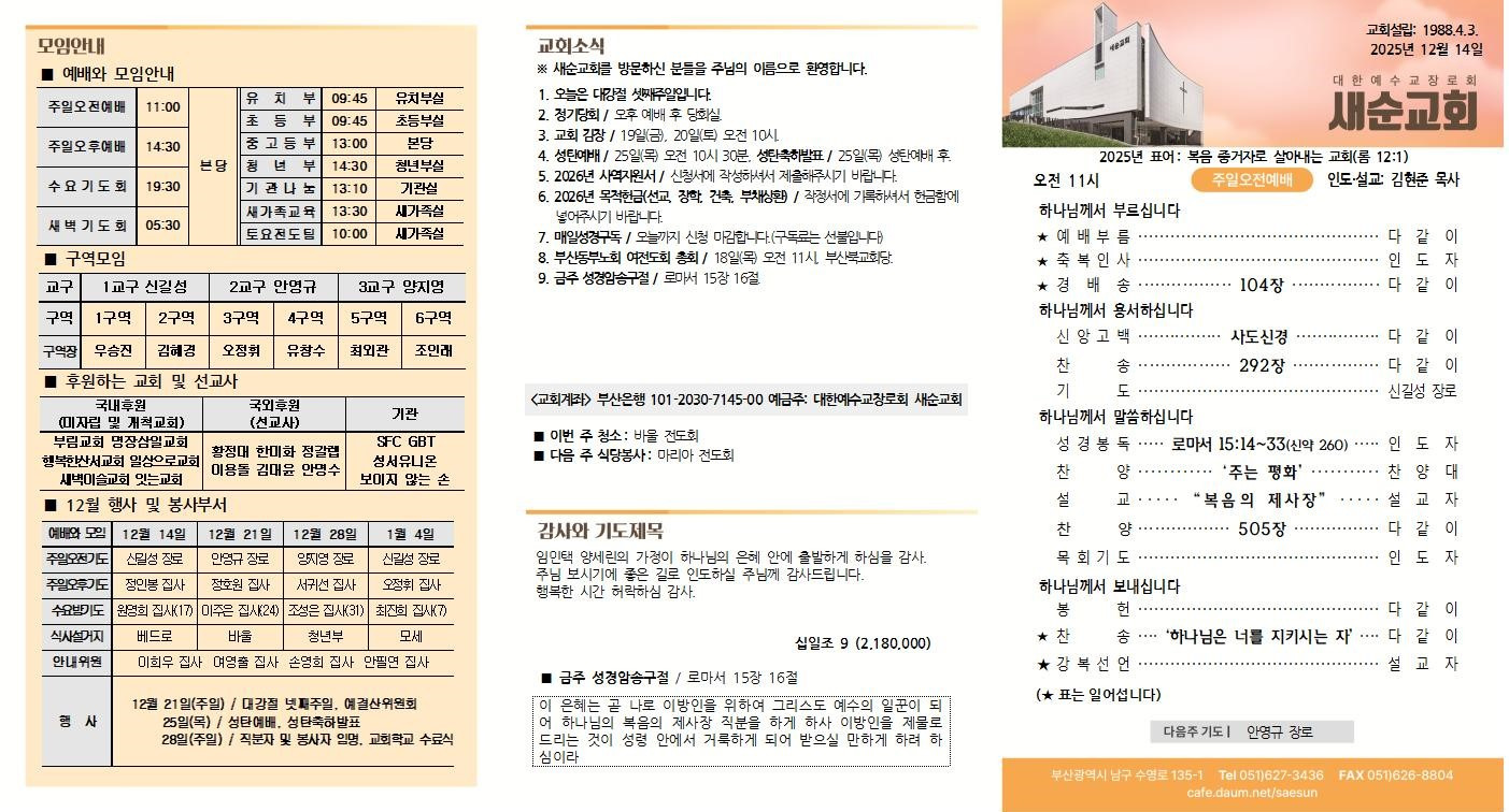 2025년 12월 14일 새순교회 주보(25-50호) 작성자최성덕|작성시간25.12.13|조회수104 목록 댓글 0 글자크기 작게가 글자크기 크게가 다음검색 현재 게시글 추가 기능 열기 북마크 공유하기 신고 센터로 신고 댓글 댓글 0 댓글쓰기 답글쓰기 댓글 리스트