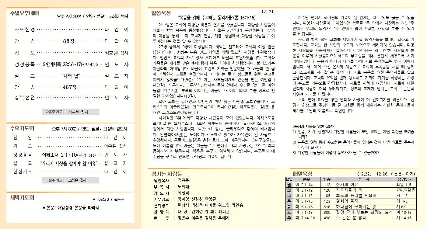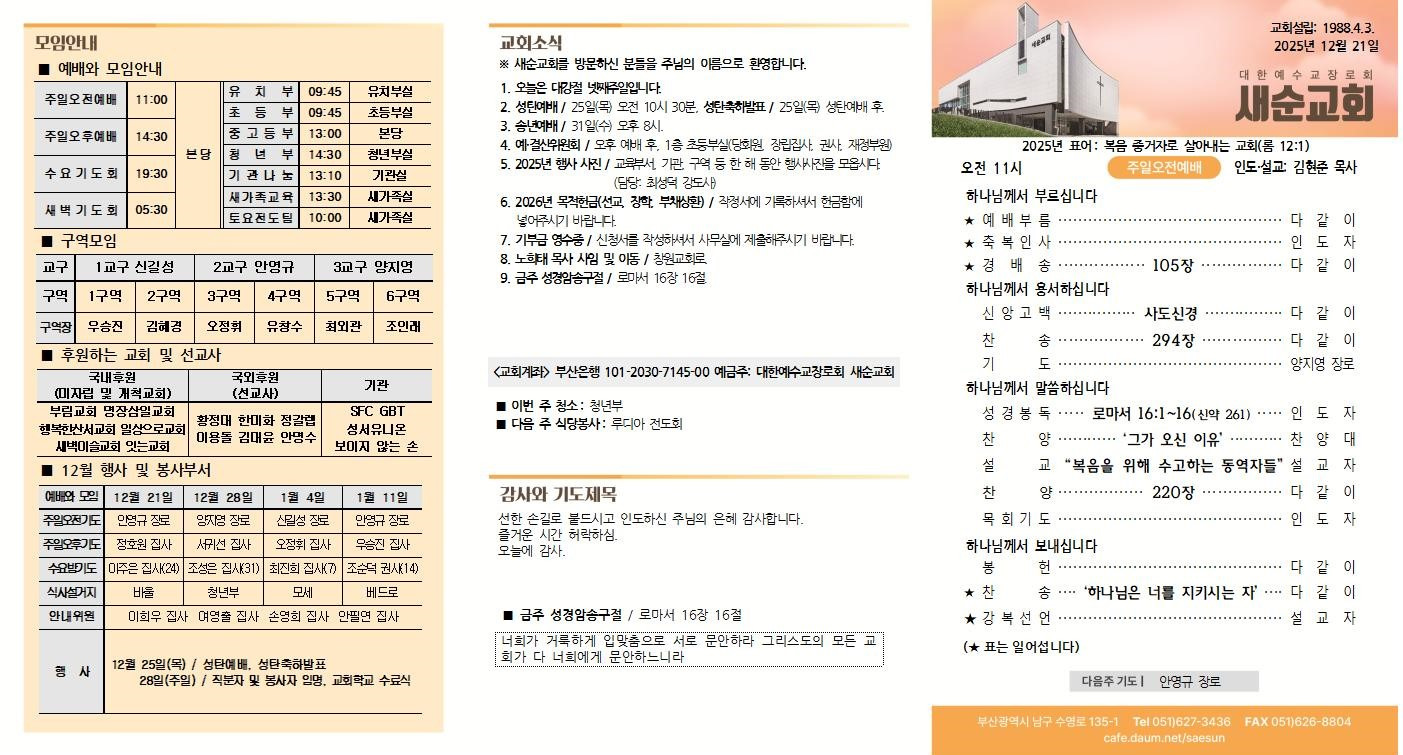 2025년 12월 21일 새순교회 주보(25-51호) 작성자최성덕|작성시간25.12.20|조회수102 목록 댓글 0 글자크기 작게가 글자크기 크게가 다음검색 현재 게시글 추가 기능 열기 북마크 공유하기 신고 센터로 신고 댓글 댓글 0 댓글쓰기 답글쓰기 댓글 리스트