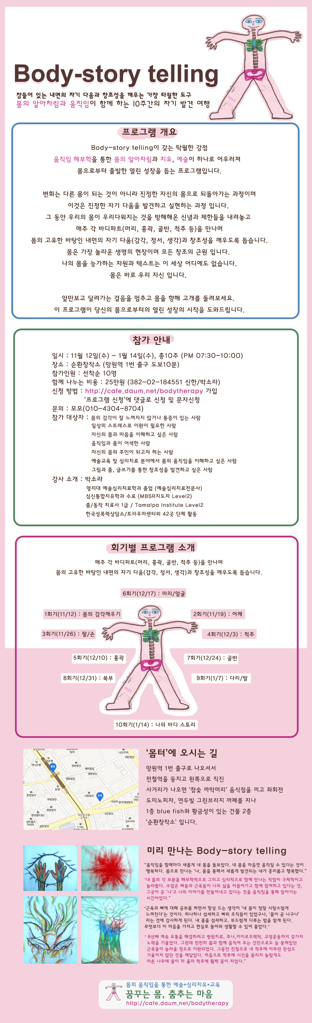 [몸의 움직임과 예술]을 통한 자기성장 및 자기치유 프로그램 소개합니다. 작성자소라|작성시간14.10.13|조회수16 목록 댓글 0 글자크기 작게가 글자크기 크게가 다음검색 현재 게시글 추가 기능 열기 북마크 공유하기 신고 센터로 신고 댓글 댓글 0 댓글쓰기 답글쓰기 댓글 리스트