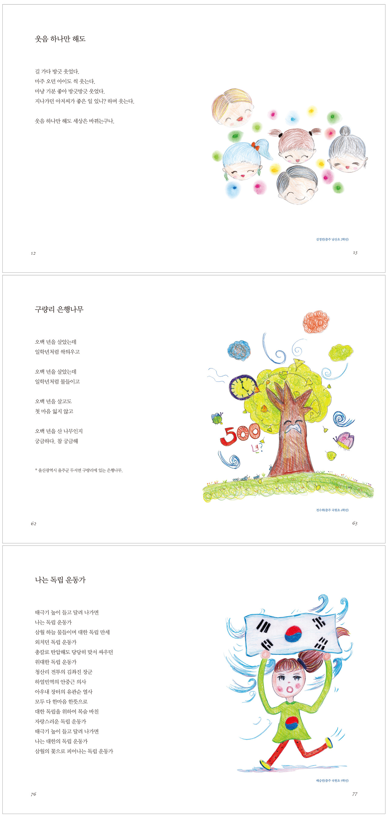 시를 읽고 쓰다 보면 무엇이든 꿈꿀 수 있습니다. 태극기 휘두르고 대한 독립을 외치며 목숨 바친 김좌진 장군, 안중근 의사, 유관순 열사와 함께 한마음 한뜻으로 싸울 수 있습니다. 미래 후손과 평화로운 세계를 위해서 삼천리 방방곡곡을 붉은 꽃송이로 물들인 할아버지, 할머니를 위해 기도할 수도 있습니다. 통일 열차를 타고 북한 땅 구석구석을 누비며 북한의 아이들과 친구가 될 수도 있습니다. 친구들끼리 싸우다가 어느새 화해하는 것처럼, 함박눈 내리는 어느 멋진 날 우리나라도 하얗게 통일된다면 얼마나 좋을까요.