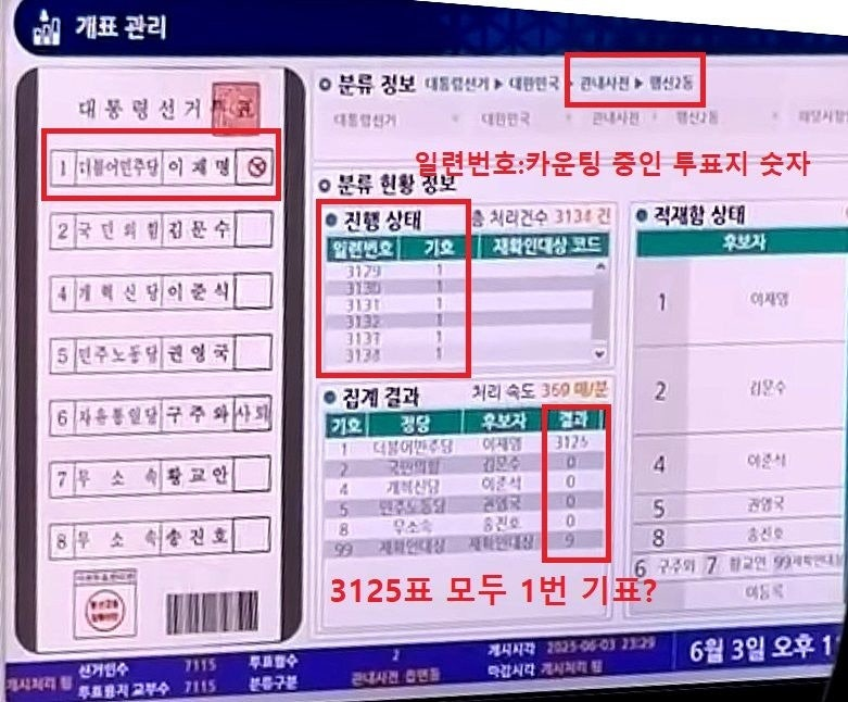 - 일련번호 순으로 연속해서 3,125장이 1번(이재명) 표로 집계됨.