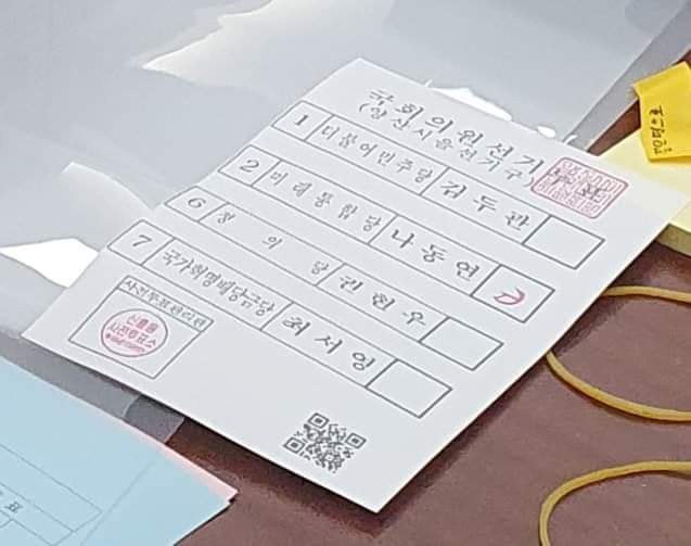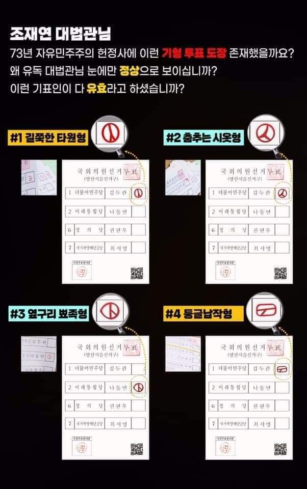 ○ 붙은 투표용지와 QR코드에 빨간 줄이 그어진 투표지 등이