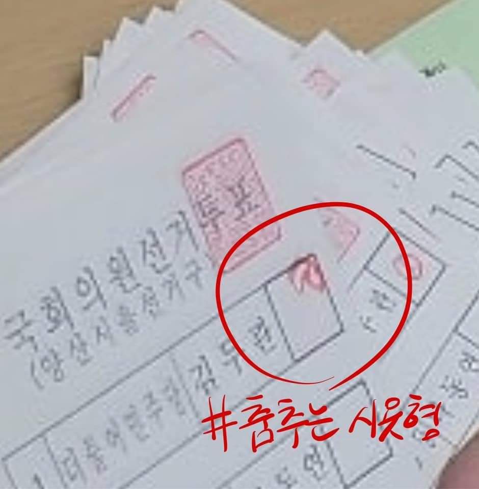 ○ 붙어있는 투표지 가운데는 풀이나 본드로 붙은 게 아니고