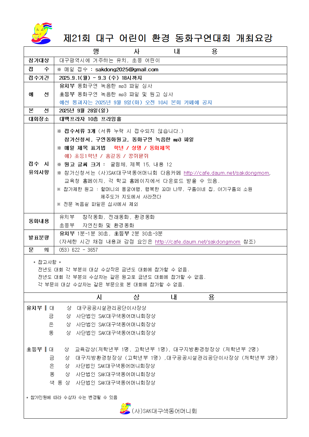 제21회 대구어린이 동화구연대회 개최요강 및 신청서 작성자홍보부|작성시간25.08.13|조회수433 목록 댓글 0 글자크기 작게가 글자크기 크게가 ※ 참가신청서는 아래 한글파일로 첨부 된 원본 파일을 다운받아 사용해주시기 바랍니다^^2025년 제21회 어린이대회 개최요강.hwp35.50KB2025년 제21회 어린이대회 참가신청서.hwp72.50KB 첨부파일첨부된 파일이 3개 있습니다. hwp 파일 2025년 제21회 어린이대회 개최요강.hwp 다운로드 hwp 파일 2025년 제21회 어린이대회 참가신청서.hwp 다운로드 png 파일 2025년 제21회 어린이대회 개최요강001.png 다운로드 다음검색 현재 게시글 추가 기능 열기 북마크 신고 센터로 신고 댓글 댓글 0 댓글쓰기 답글쓰기 댓글 리스트