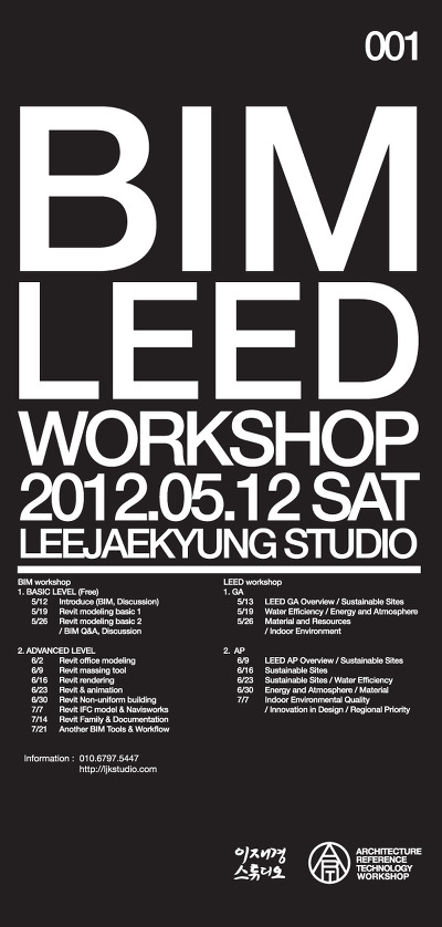 안녕하세요, 이재경스튜디오입니다. 스튜디오를 오픈하고 워크샵을 진행하려고 합니다. 주제는 "건축 참조 기술" 입니다. 지금의 최대 화두인 BIM 과 LEED 를 다루려고 합니다. BIM에 대한 토론과 Revit 툴에 대한 내용이 들어가고, LEED 인증 시험을 위한 강의를 들을 계획입니다. 자세한 내용은 http://ljkstudio.com/index.php?/workshop/001/ 에 올려놓겠습니다.