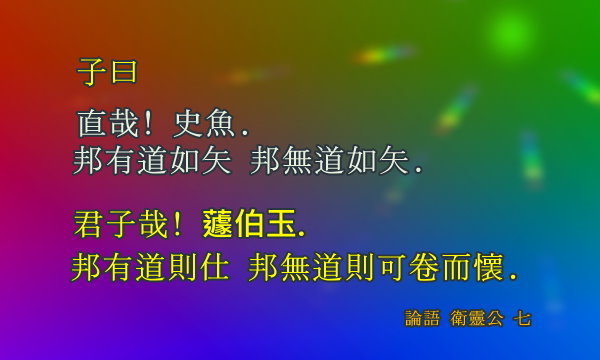 ●子曰:直哉!史魚。邦有道如矢,邦無道如矢。」君子哉!蘧伯玉。邦有道則仕,邦無道則可卷而懷之。」