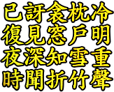 已: 그칠 이, 이미, 매우. 訝: 맞을 아, 놀라다. 이상하다. 已訝: 매우 이상하다. 衾: 이불 금. 枕: 베게 침. 冷: 찰 랭. 復: 다시 부. 時: 때때로, 이따금. 折: 꺽을 절.