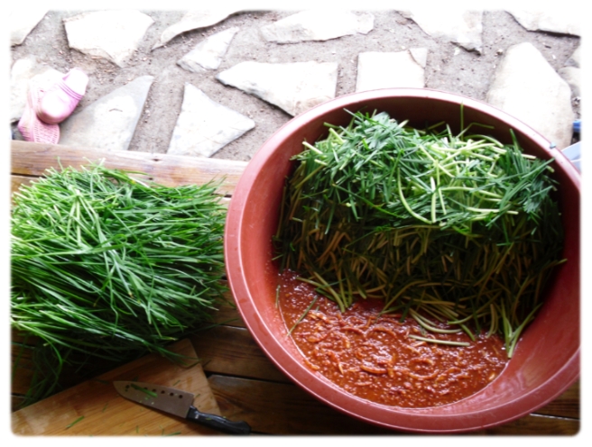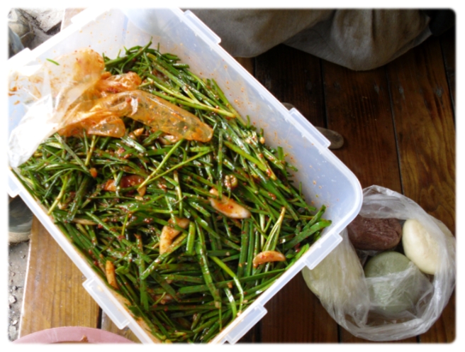 야는 부추김치야요 우개 고구마줄기 김치랑 양념은 같고요