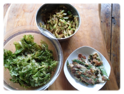 아니? 부추 띁어온 사이에 은제 호박너물에 상추무침까정?