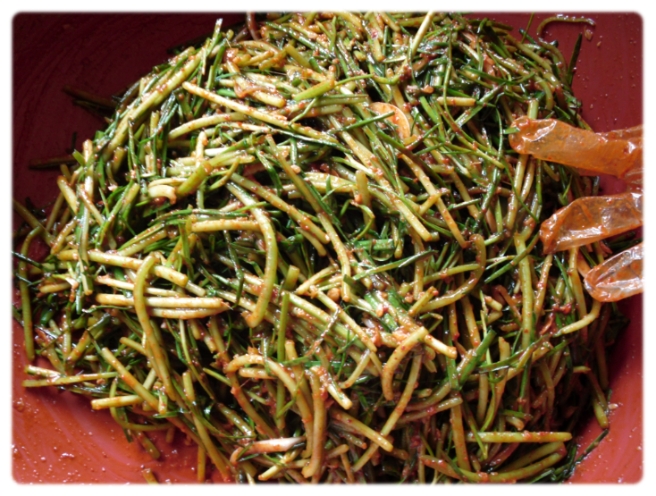 양념을 한쪽으로 홱 밀어논 담에 고구마순 한켜..부추한켜..