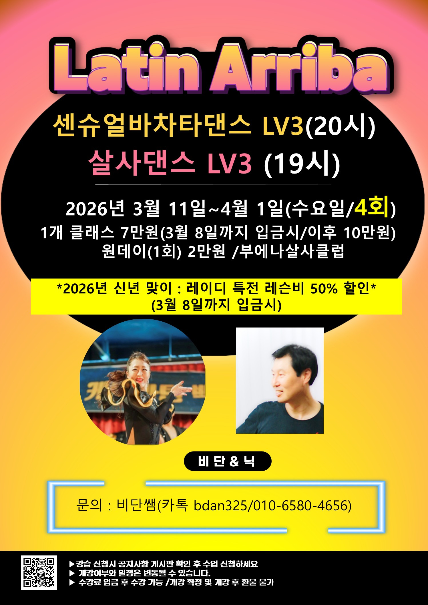 [수업 공지]라틴아리바 _ 3월 11일 개강 #센슈얼바차타댄스 레벨 3 수요반(4회) 7시 _ #비단 & #닉 - 레이디 50% 할인