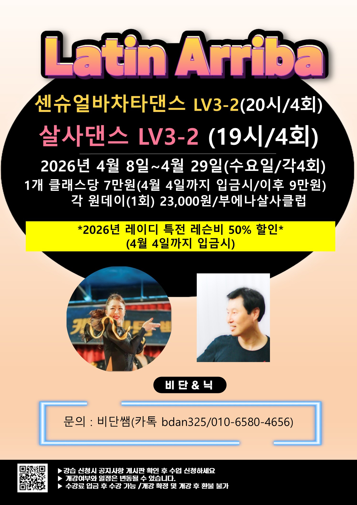 라틴아리바 _ 4월 8일 개강 살사댄스 레벨 3 -2 수요반(4회) 19시 _ 비단 & 닉 - 레이디 50% 할인~!!