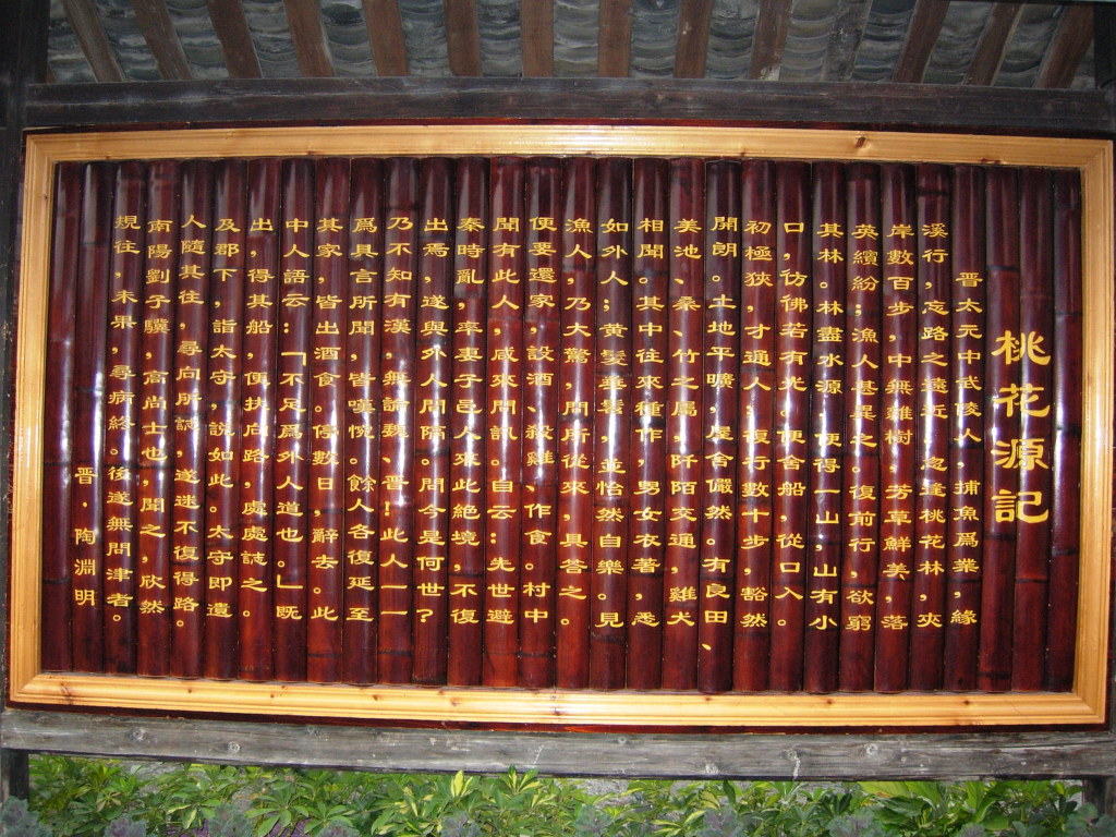 晋太元中, 武陵人, 捕魚爲業, 緣溪行, 忘路之遠近, 忽逢桃花林. 夾岸數百步, 中無雜樹, 芳草鮮美, 落英 紛. 漁人甚異之. 復前行, 欲窮其林. 林盡水源, 便得一山. 山有小口, 佛若有光. 便舍船, 從口入. 初極狹, 才通人; 復行數十步, 豁然開朗. 土地平曠, 屋舍儼然, 有良田美池桑竹之屬; 阡陌交通, 鳥犬相聞. 其中往來種作, 男女衣著, 悉如外人; 黃髮垂 , 幷怡然自樂. 見漁人, 乃大驚; 問所從來, 具答之. 便要還家, 設酒殺鷄作食; 村中聞有此人, 咸來問訊. 自云先世避秦時亂, 率妻子邑人來此絶境, 不復出焉; 遂與外人間隔. 問今時何世, 乃不知有漢, 無論魏晋. 此人一一爲具言所聞, 皆嘆 . 余人各復延至其家, 皆出酒食; 停數日; 辭去. 此中人語云; "不足爲外人道也". 旣出, 得其船, 便扶向路, 處處志之. 及郡下, 詣太守, 說如此. 太守卽遣人隨其往, 尋向所志, 遂迷, 不復得路. 南陽劉子驥, 高尙士也, 聞之, 欣然規往. 未果, 尋病終. 後遂無問津者.