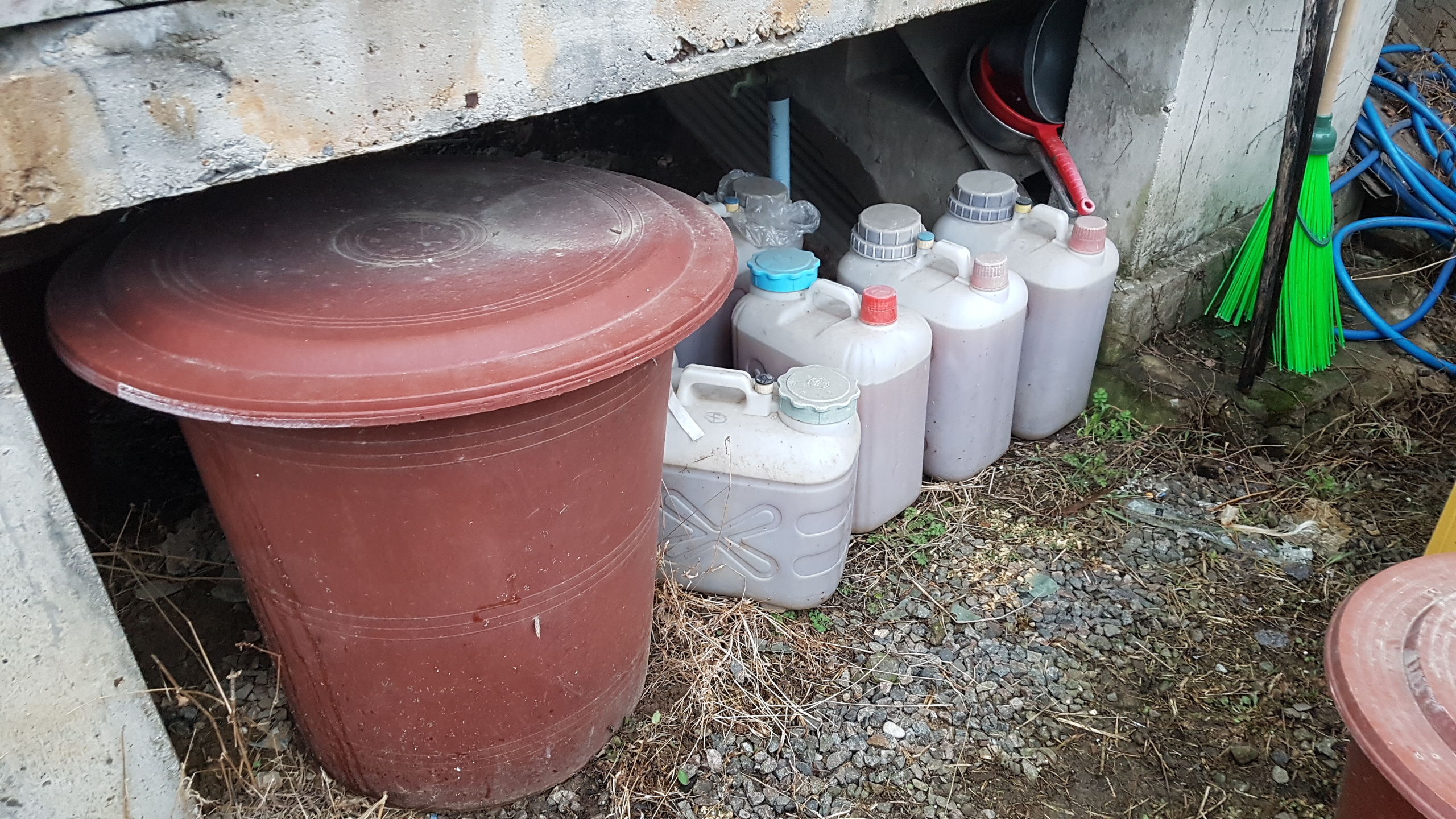 저희 집 현관 아래에는 고무통이 여러 개 있어 거기에 오줌을 받습니다. 연중 계속 받으면서 오래된 것부터