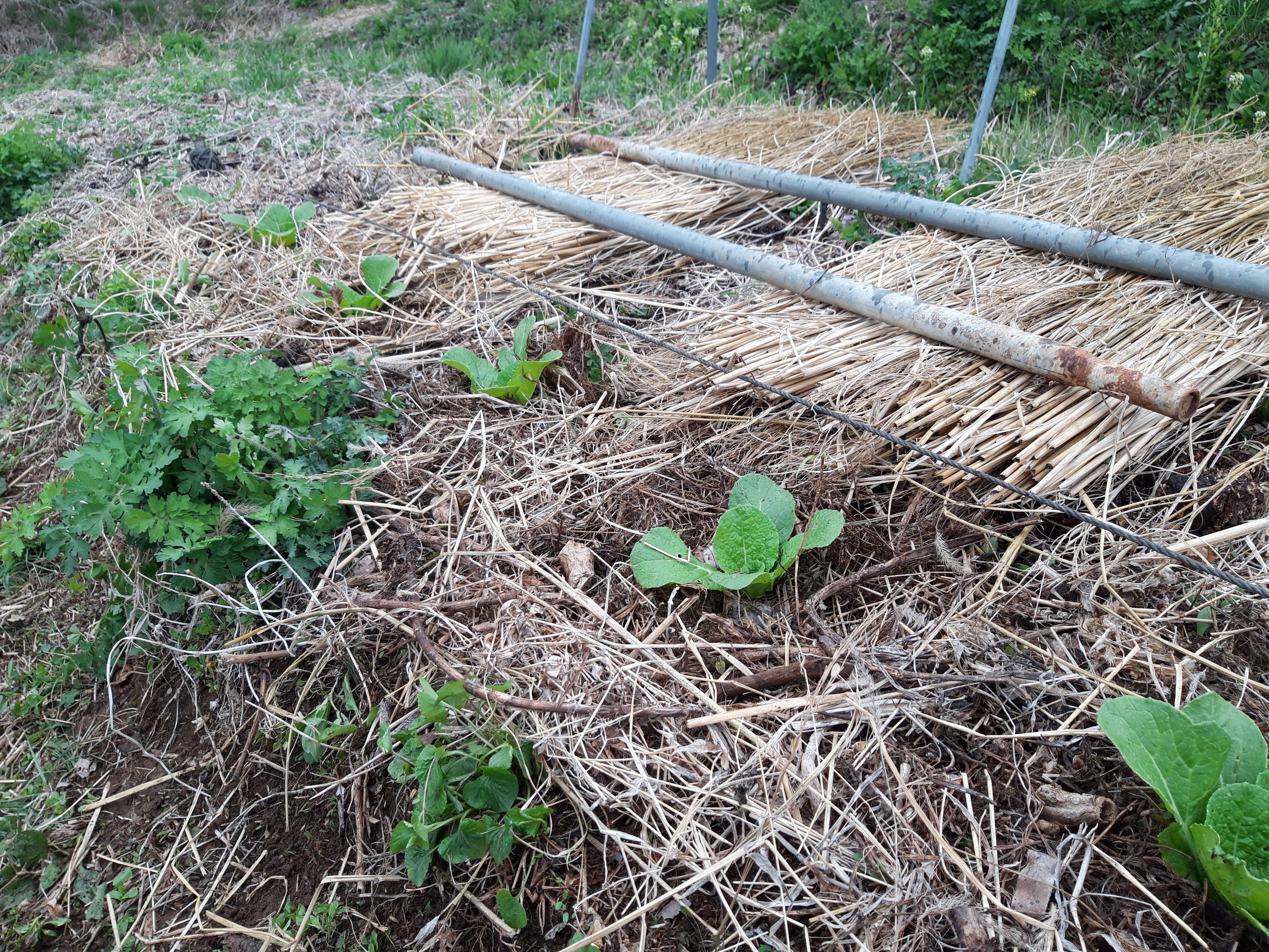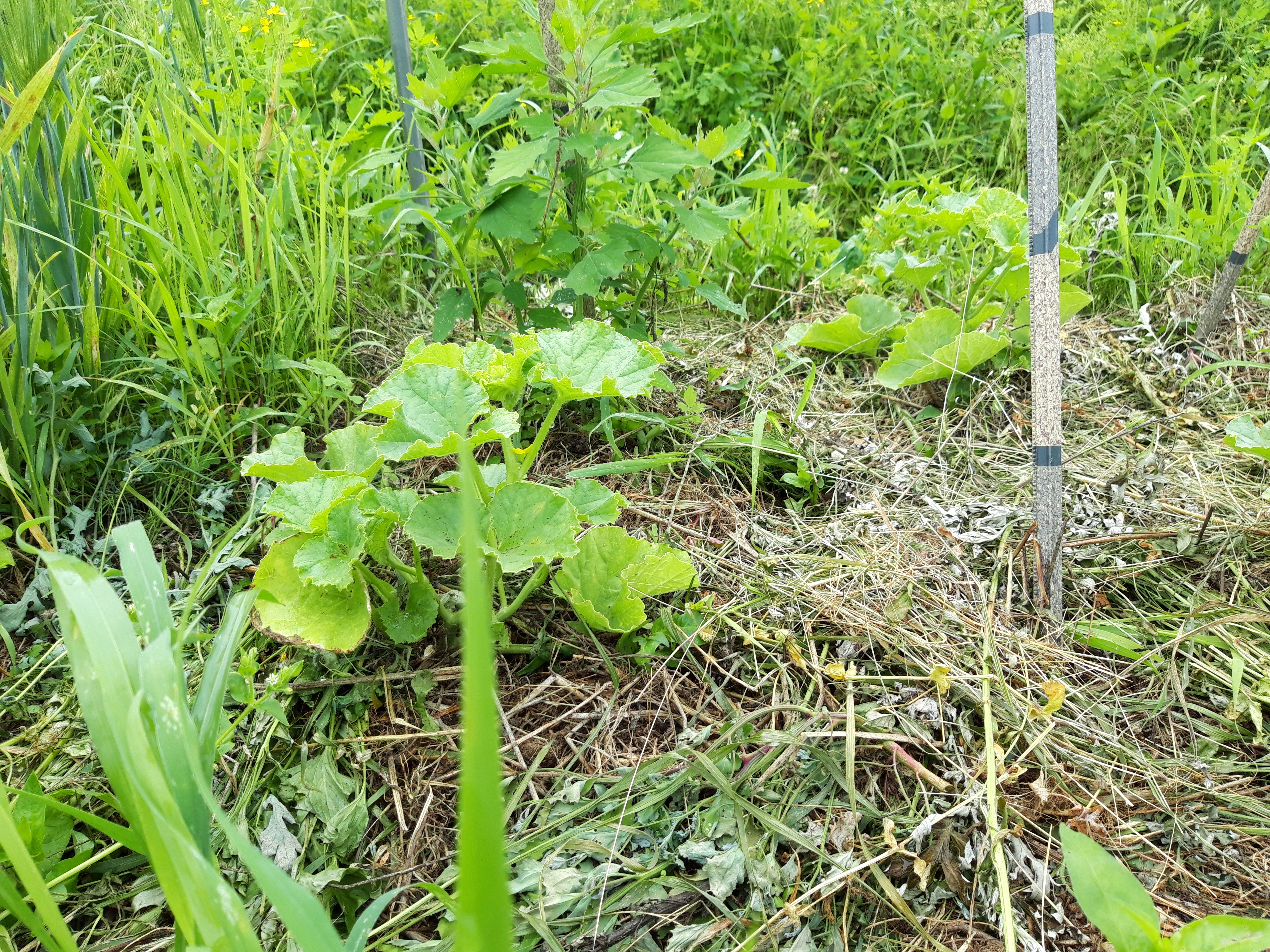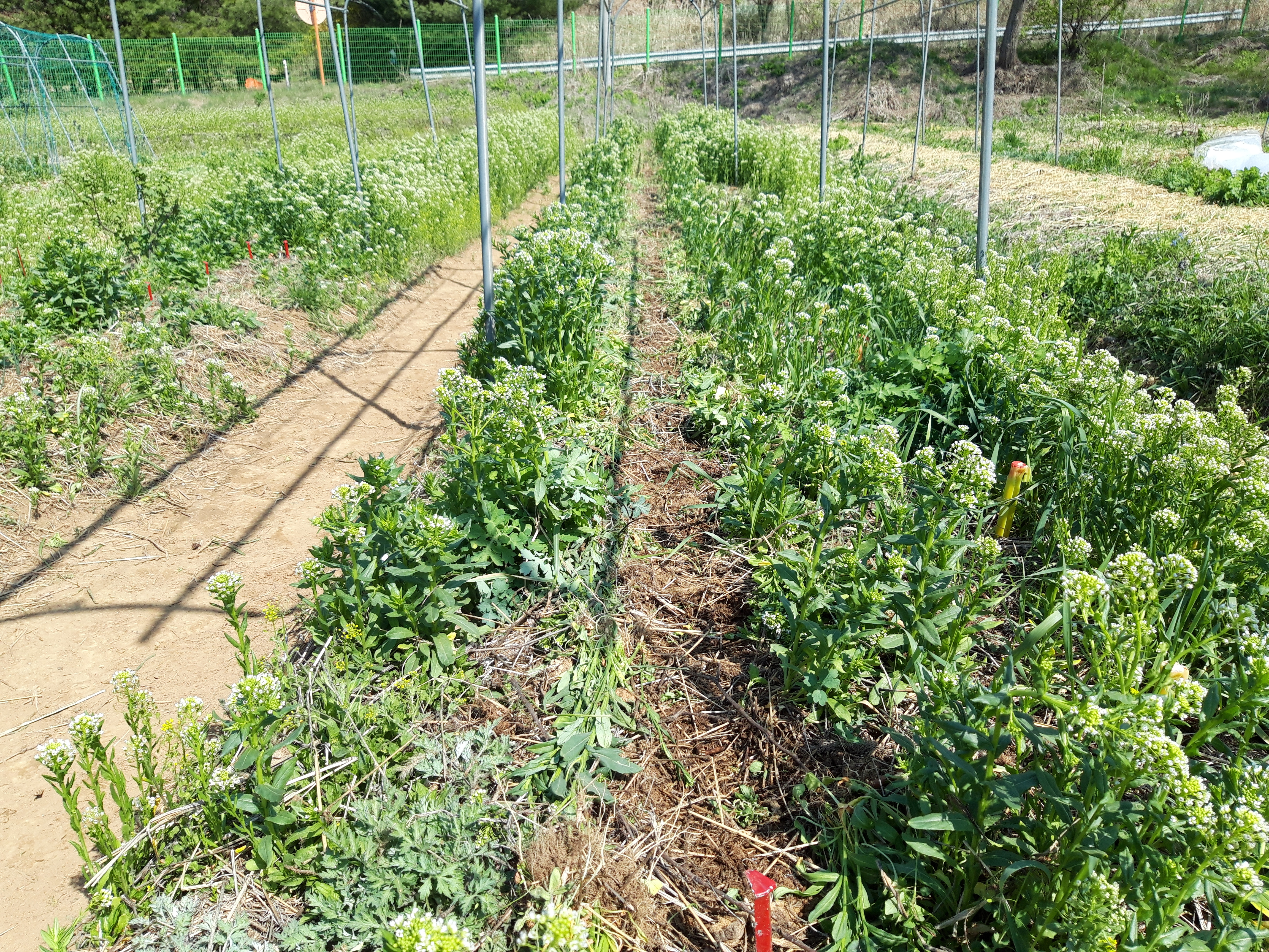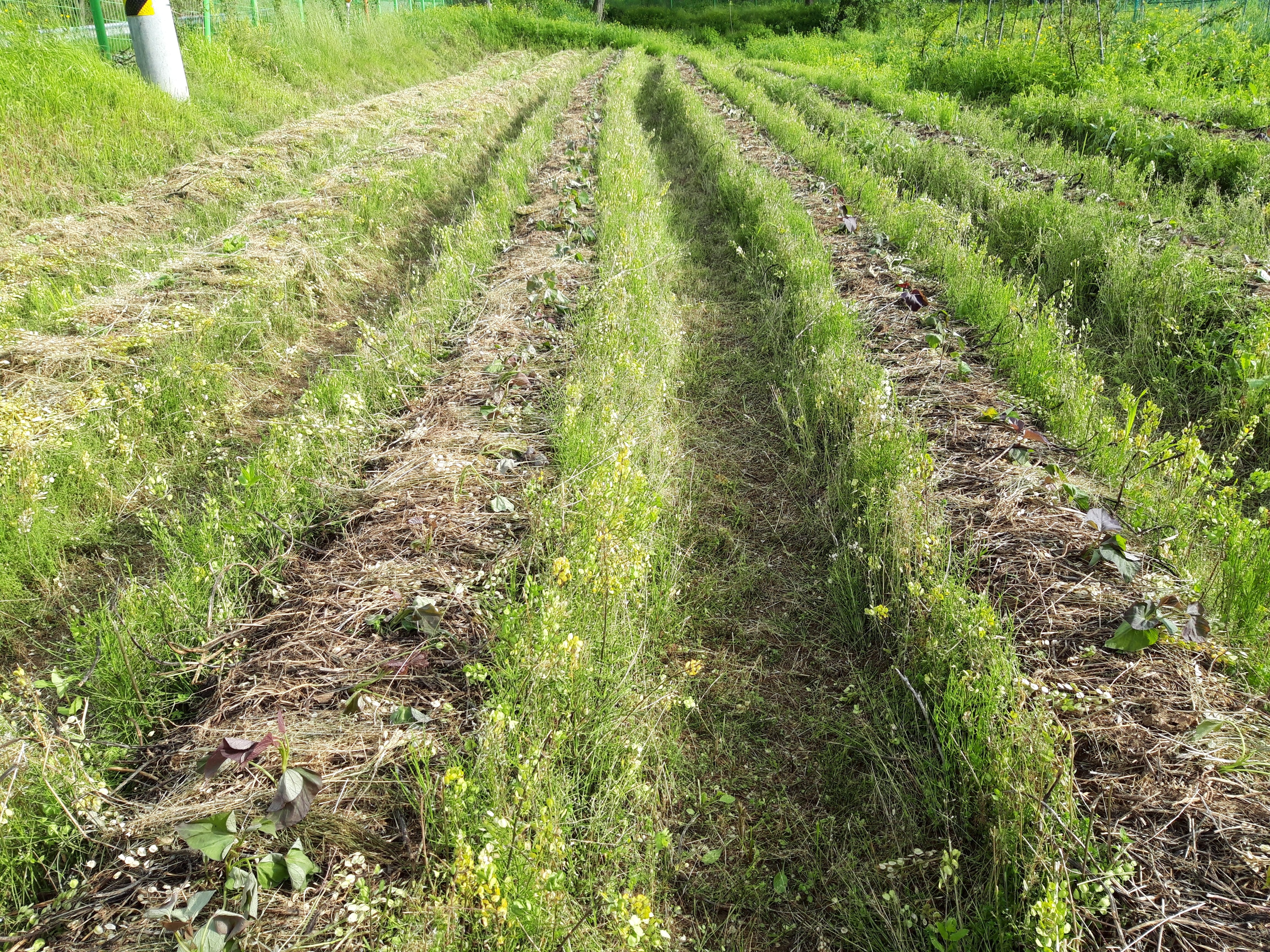 풀 가운데로 풀을 정리하고 뭔가 직파를 했습니다. 풀이 자라기 전에 심을 자리를 표시한 노란말뚝과 빨간말뚝이 보입니다.