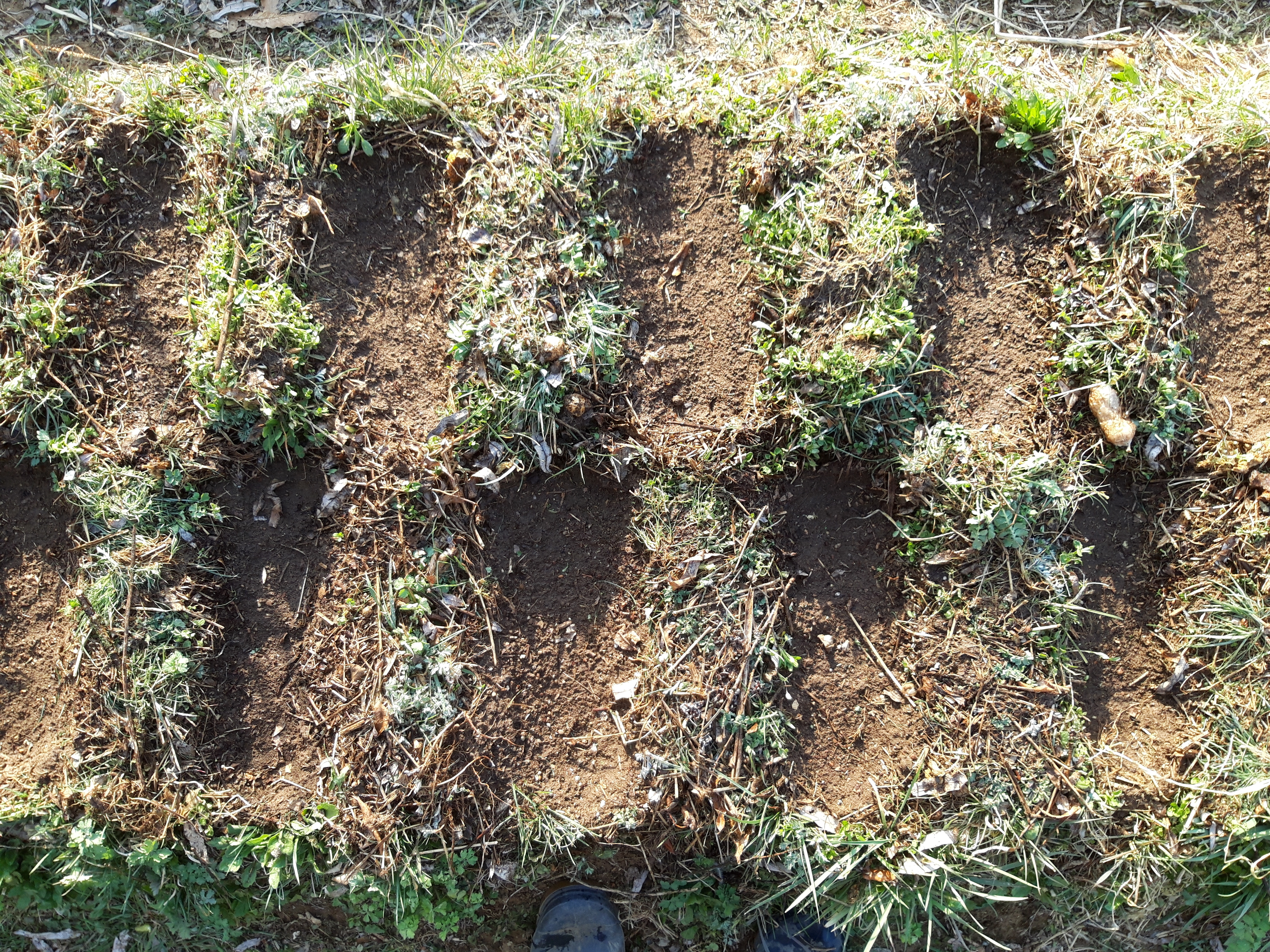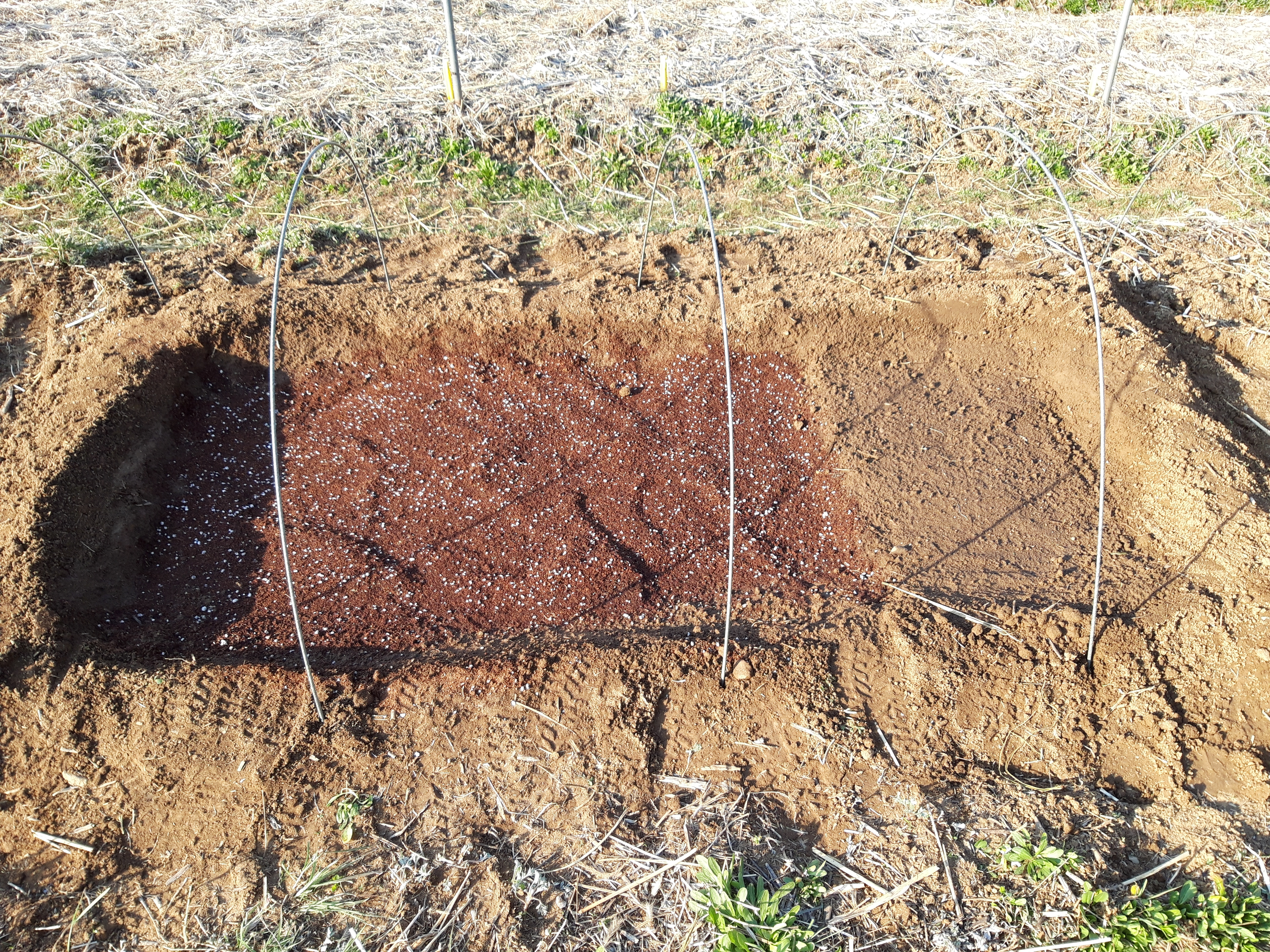 밭에서 육묘하는 곳입니다. 왼쪽은 상토, 오른쪽은 맨땅입니다. 깊이 10cm정도로 파서 상토를 담고 파낸 흙은 주변에 쌓아서 축열효과를 봅니다.