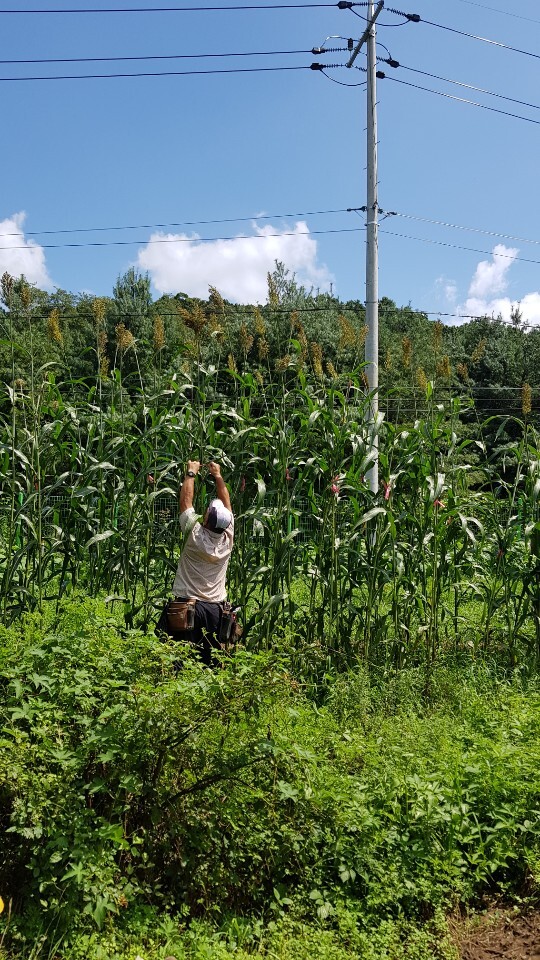 8월 태풍이 불기 전 수수를 3포기씩 삼각형으로 묶어주어야 넘어지지 않습니다.