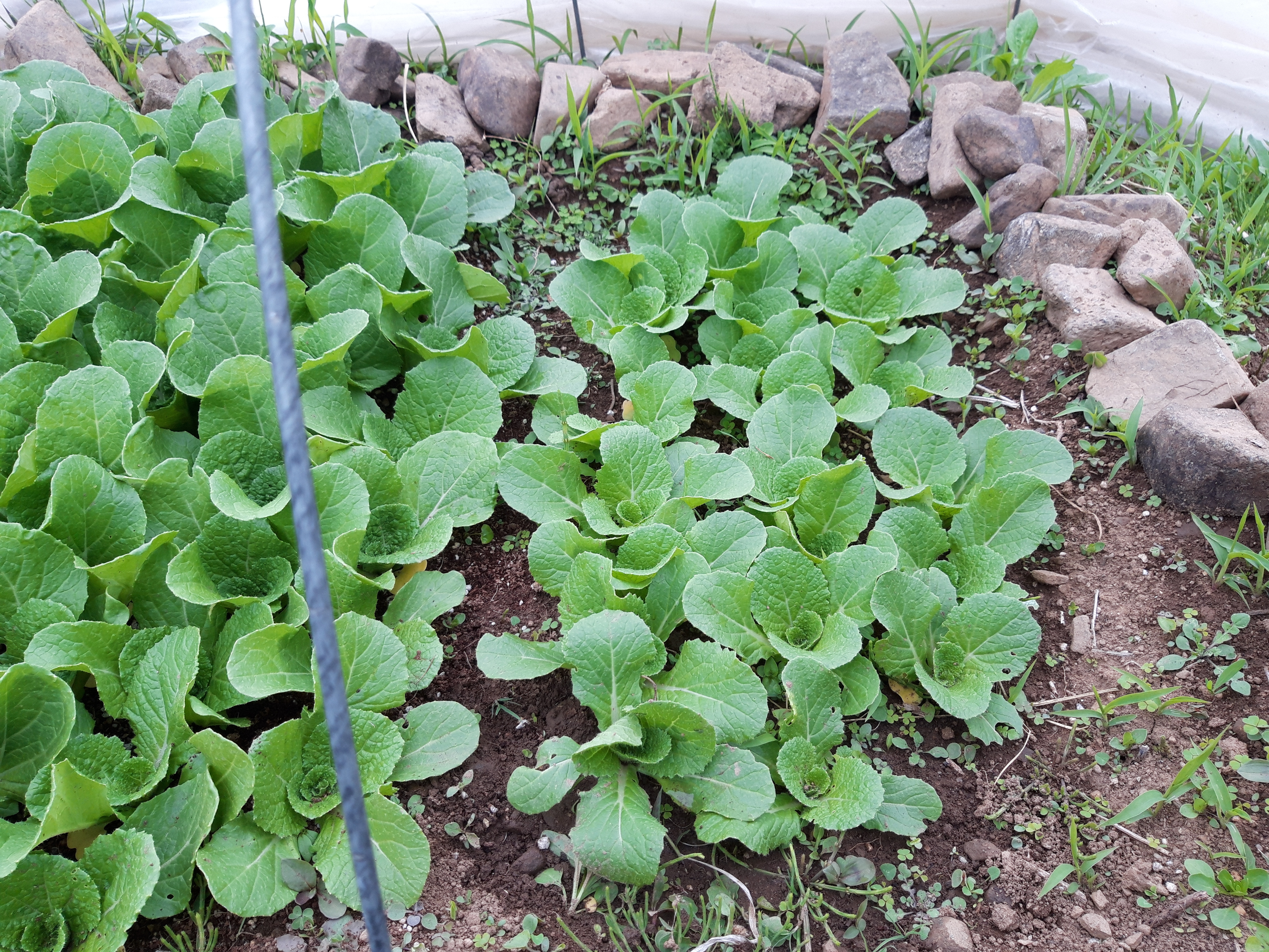 앞의 사진 육묘상에서 자란 봄배추입니다. 왼쪽은 상토, 오른쪽은 맨땅입니다. 맨땅에서 자란 것이 더 똘망똘망합니다. 둑처럼 쌓은 흙위에 돌을 얹어 축열효과를 높입니다.