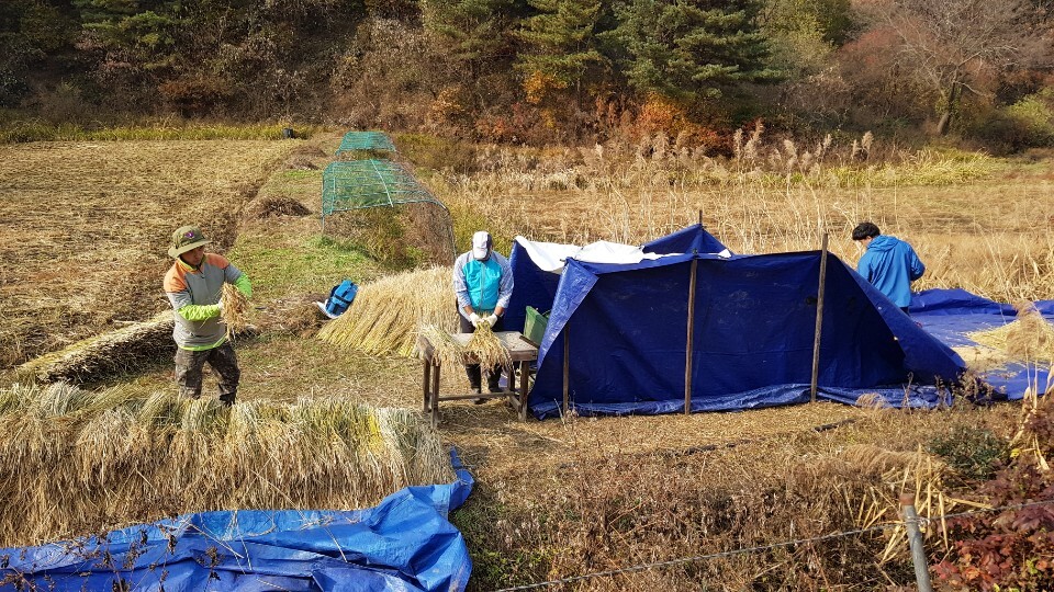 벼를 털어 한쪽에서 말리면서 볏짚을 잘라 논에 다시 넣습니다.