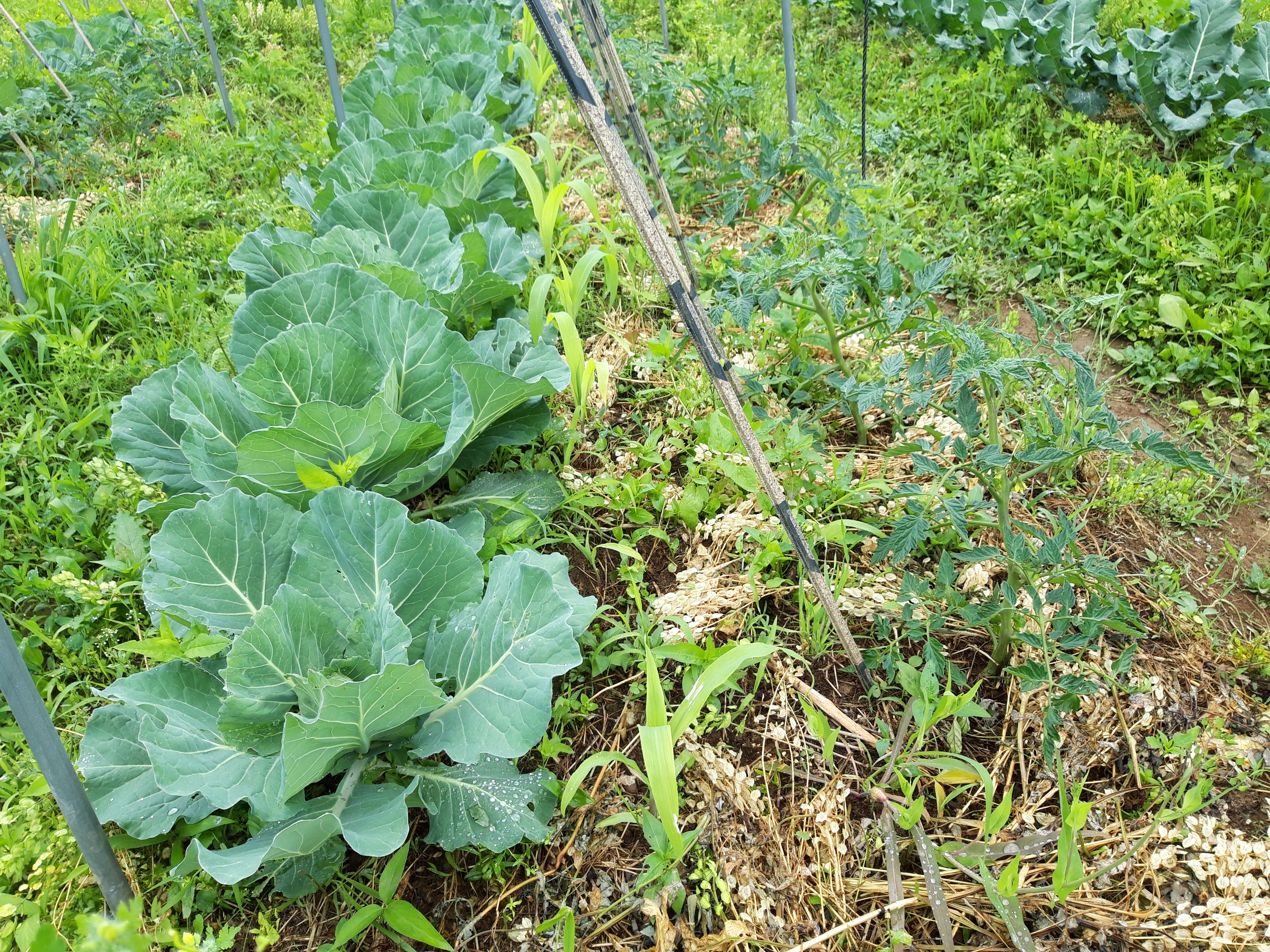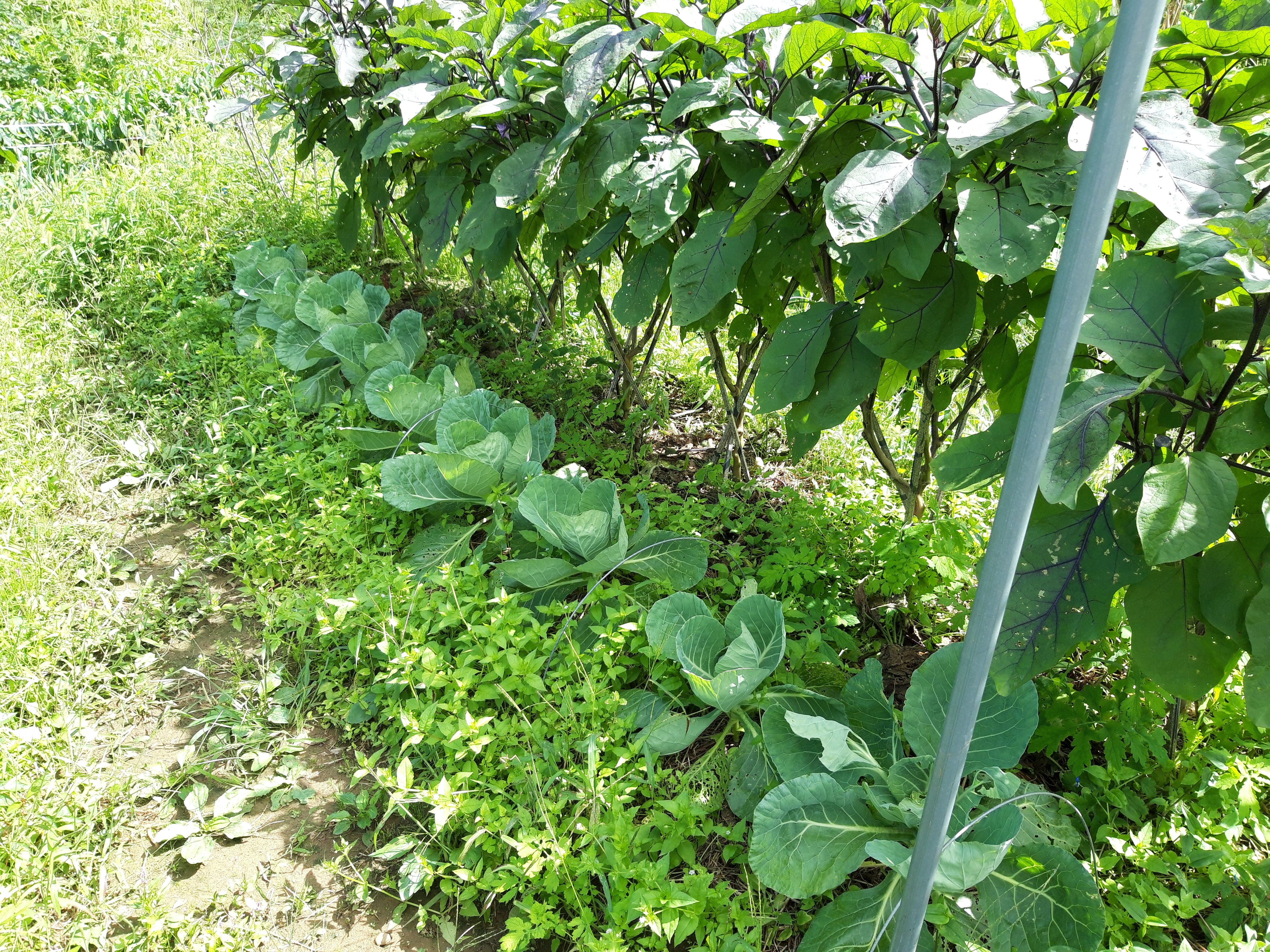 오른쪽에 가지가 100~120cm 자란 여름입니다. 가지로부터 70~80cm 떨어지면 한 여름 그늘 경계선이 됩니다. 그곳에 양배추를 심으면 한여름엔 반그늘, 자라면서 그늘에서 벗어나게 되고 날씨도 서늘해지기 시작합니다.