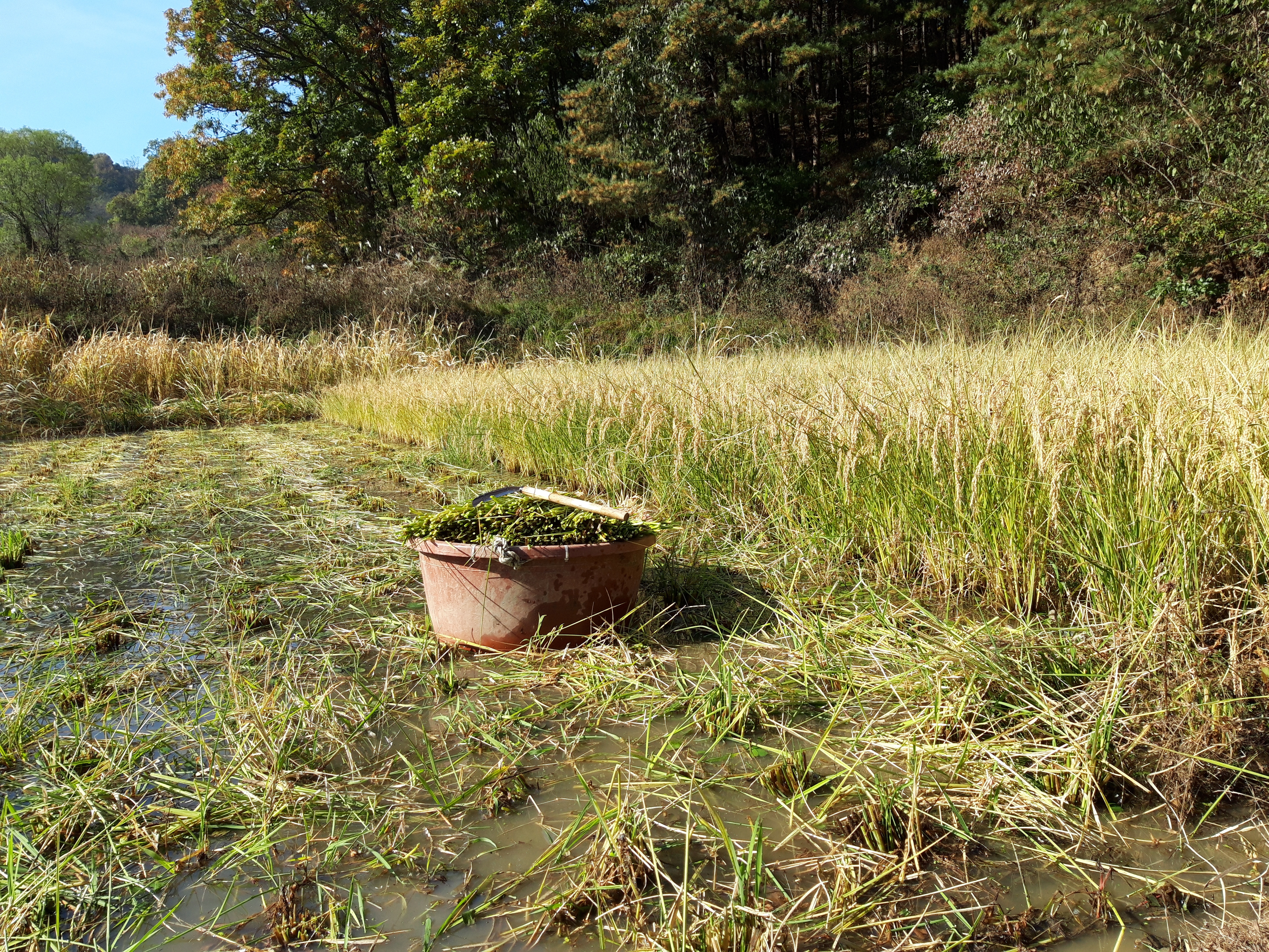 가을에도 물을 빼지 않고 고무다라이를 갖고 들어가 벼를 베어 나옵니다.