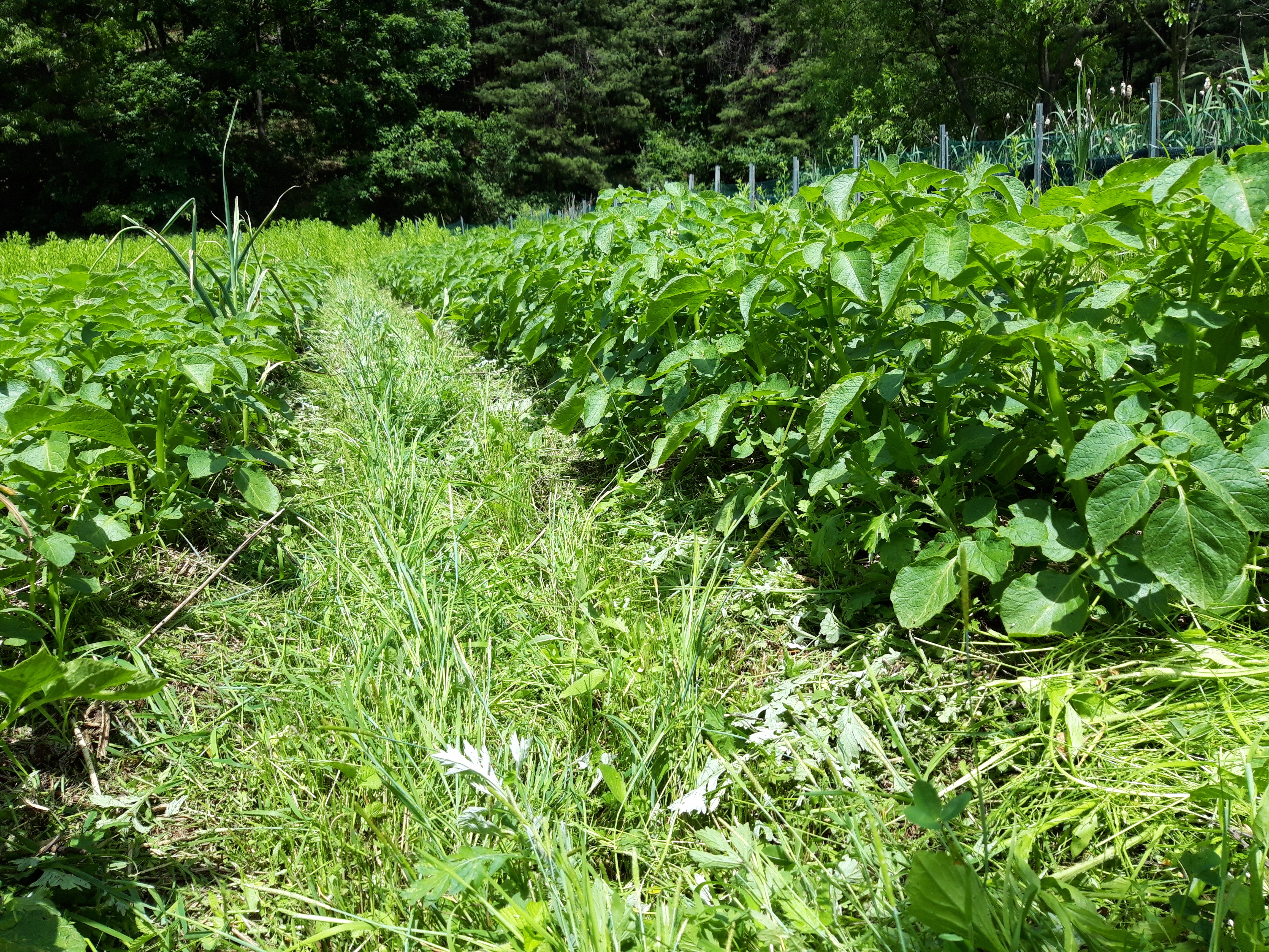 고구마는 건조한 것을 좋아하지만 심고나서 한달간은 습윤한 상태가 좋습니다. 그래서 정식할 때 두둑 양옆에 풀을 남기고 심습니다.