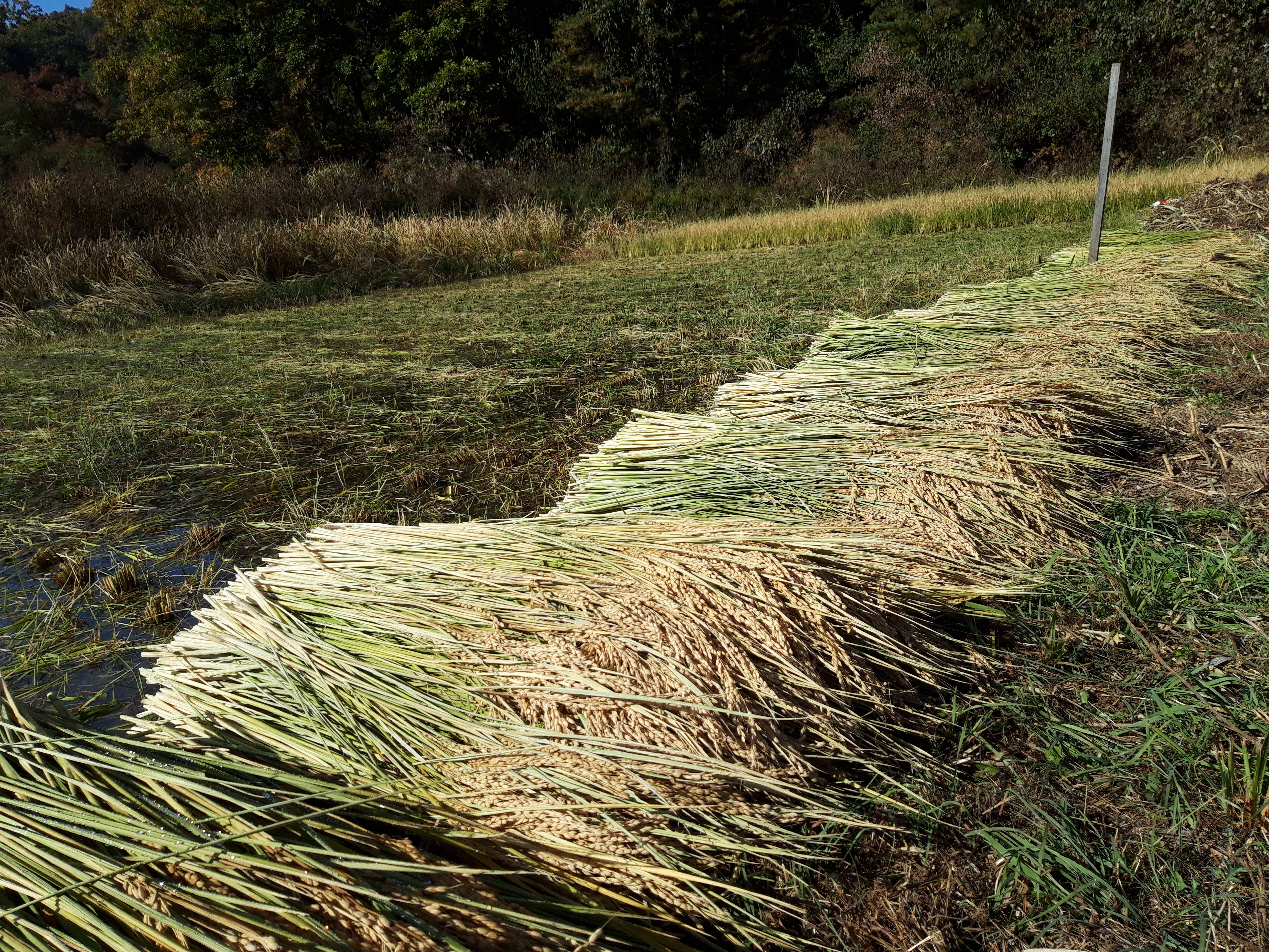 벼를 베어 논두렁에서 1차 말립니다.