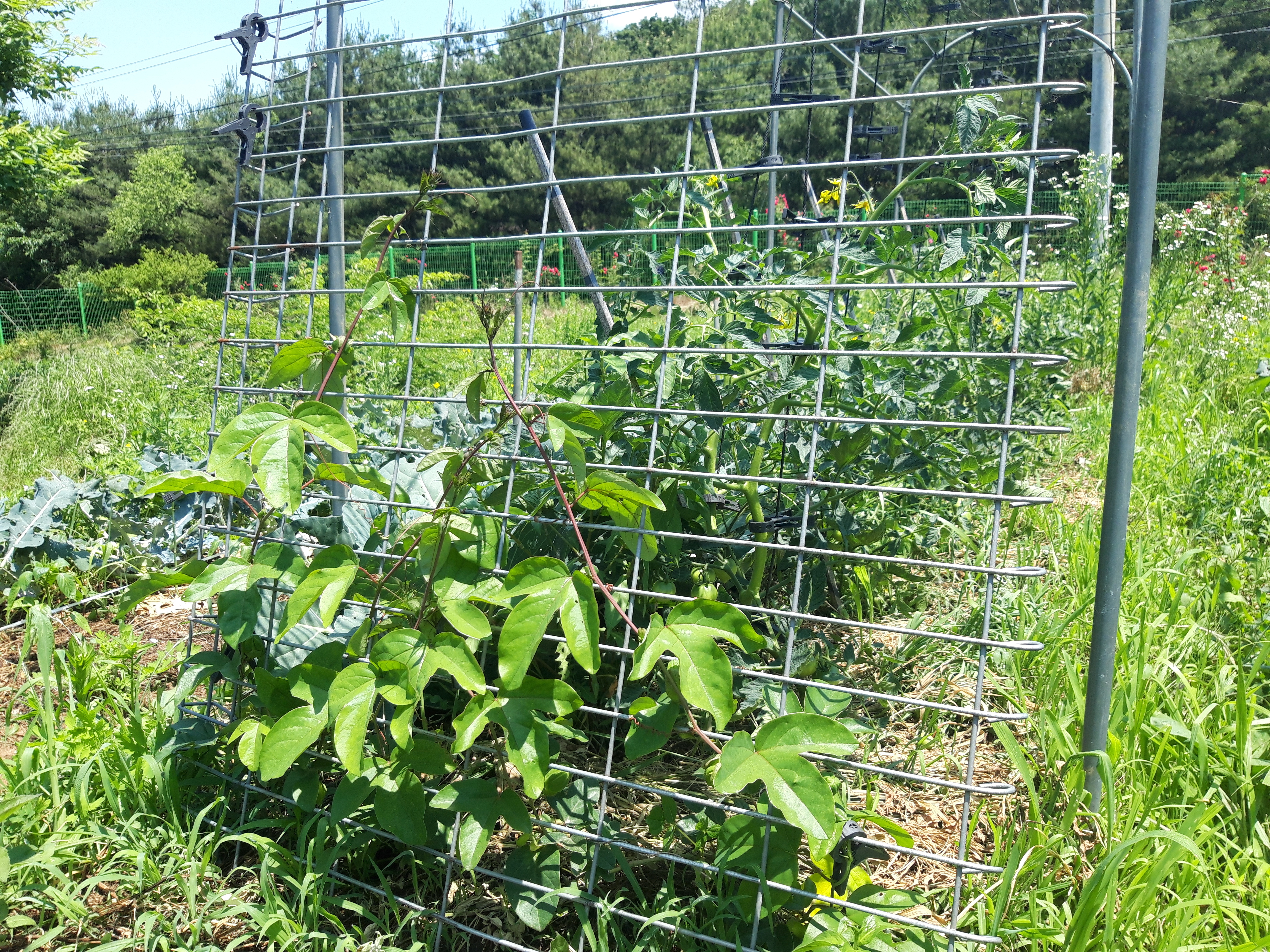안쪽에는 토마토가, 바깥쪽에 트렐리스에는 시계꽃이 자랍니다. 시계꽃은 꽃이 이국적으로 이쁩니다만 다년생이라도 이곳이 너무 추워 겨울에 먼저 모두 갔습니다.