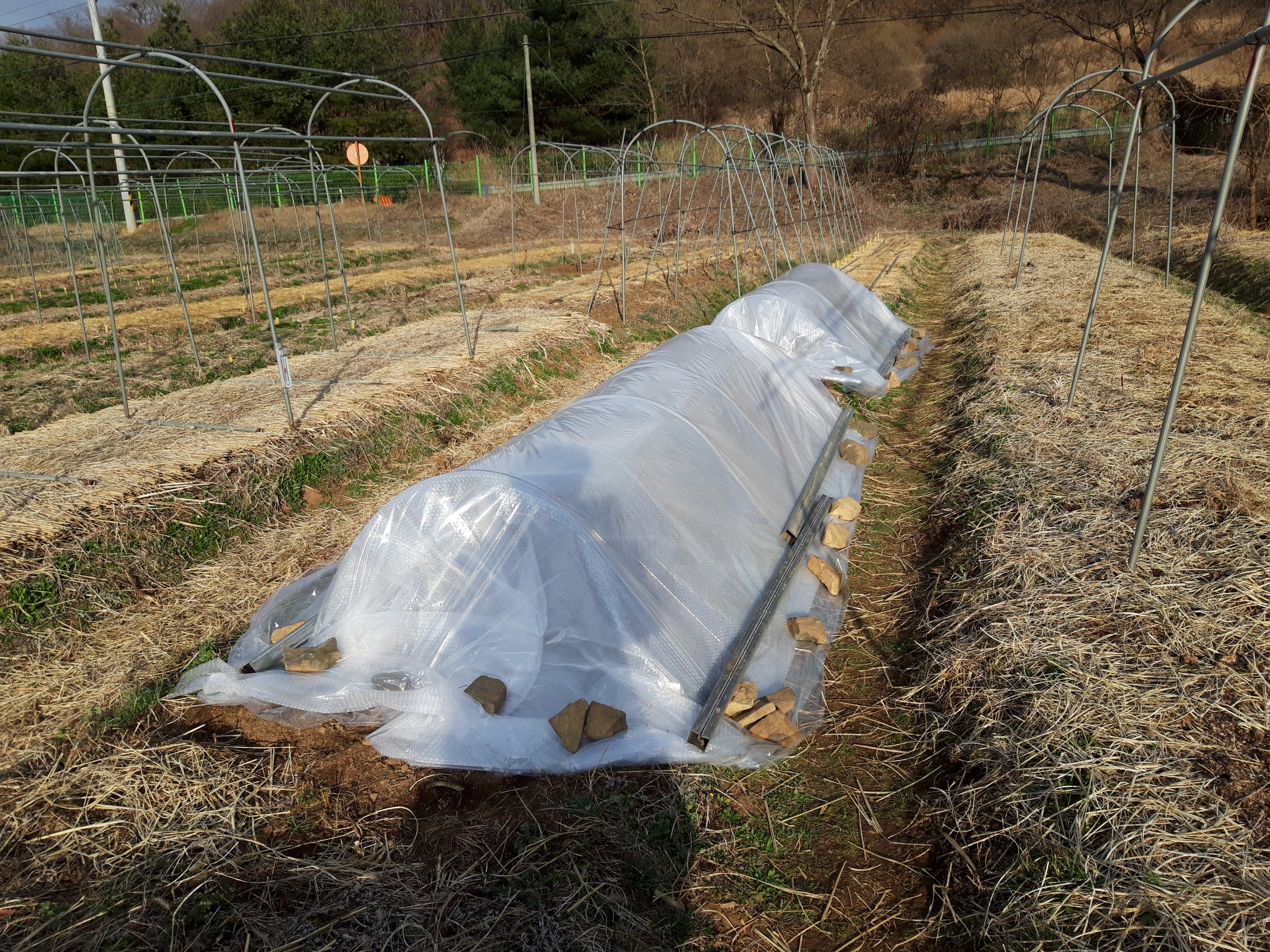 속비닐과 4mm뽁뽁이 2겹, 겉비닐로 덮었습니다. 외부의 최저온도보다 평균 4~5도 보온효과가 있습니다.