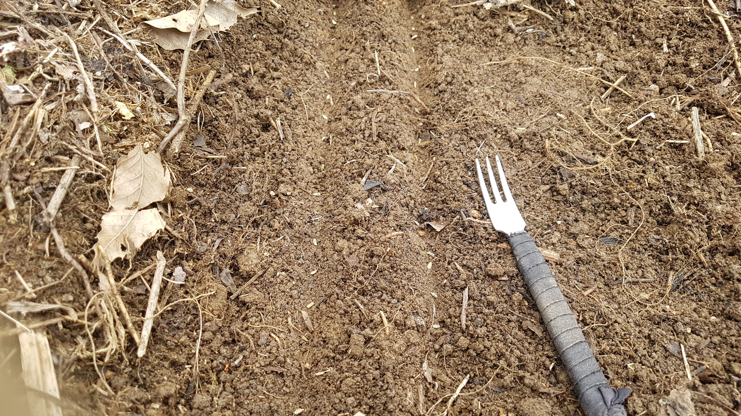 2. 오후부터 당근 파종을 시작했다. 논란의 당근이랑에는 다년생 풀이 많아 두둑 정리하기가 쉽지 않다. 두둑 면도 너무 울퉁불퉁하여 전면적으로 두둑 면을 골라가면서 파종한다. 30~35cm간격으로 2줄씩 선파한다. 최종적으로 포기당 10cm의 거리가 필요하므로 2줄에서 지그재그식으로 당근을 남기면 되겠다. 당근 씨앗은 발아가 불량하여 1cm간격으로 씨앗을 떨어뜨린다. 씨앗이 가려지면서 최대한 복토를 얇게 하려 노력한다. 파종 후에 맨땅으로 두려니 좀 안쓰럽다.