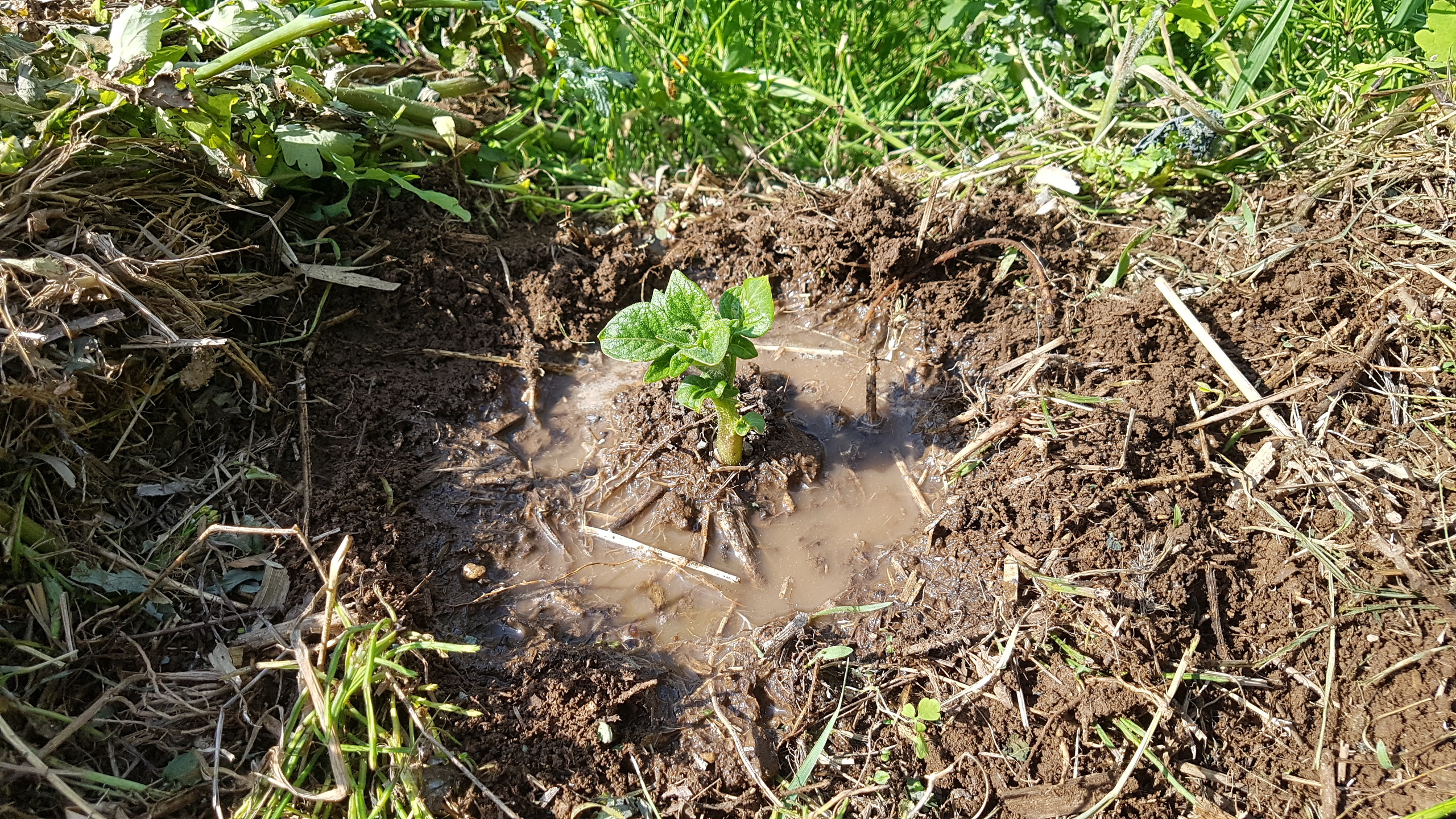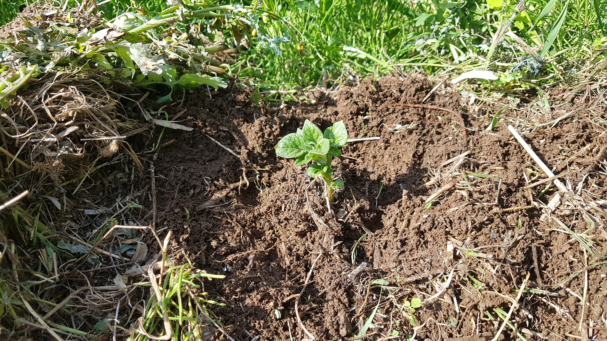 2. 어제는 길밭, 오늘은 논란의 감자 포기정리를 했다. 모든 싹이 나왔으나 역시 논란2번3단 중이랑 서쪽에 몇 포기가 아직 싹이 나오지 않았다. 5~6개정도는 안 나올지도 모른다. 그동안 여러 번 고민했으나 올해는 북주기를 했다. 씨감자를 깊게 심으면 싹이 더디 나오고 얕게 심으면 감자의 일부분이 밖으로 나와 햇빛을 봐 녹색으로 변한다. 자연농에서는 풀이 덮여있으므로 북주기가 불필요하다고 하나 나의 경우 매년 여러 개의 녹색으로 변한 감자를 보게 된다. 1개를 남긴 감자싹 주변에 지름 10cm정도로 1:1:1 오뜨물을 주고 옆 포기와 살짝 교차할 정도인 지름 15~20cm로 넓게 북주기를 했다. 흙을 덮는 두께는 4~5cm정도. 올해는 이번 한번만으로 결과를 본다. 중만생 두백이라 싹이 늦고 싹의 길이도 들쑥날쑥하다. 자라는 과정을 보기로 한다.